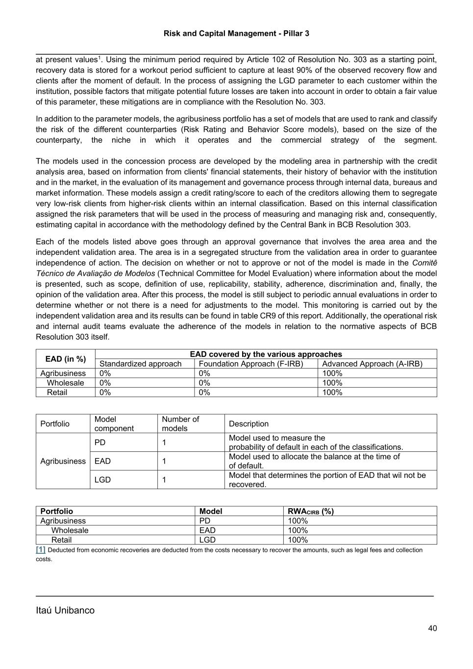 Risk and Capital Management - Pillar 3 __________________________________________________________________________________________ __________________________________________________________________________________________ Itaú Unibanco 40 at present values1. Using the minimum period required by Article 102 of Resolution No. 303 as a starting point, recovery data is stored for a workout period sufficient to capture at least 90% of the observed recovery flow and clients after the moment of default. In the process of assigning the LGD parameter to each customer within the institution, possible factors that mitigate potential future losses are taken into account in order to obtain a fair value of this parameter, these mitigations are in compliance with the Resolution No. 303. In addition to the parameter models, the agribusiness portfolio has a set of models that are used to rank and classify the risk of the different counterparties (Risk Rating and Behavior Score models), based on the size of the counterparty, the niche in which it operates and the commercial strategy of the segment. The models used in the concession process are developed by the modeling area in partnership with the credit analysis area, based on information from clients' financial statements, their history of behavior with the institution and in the market, in the evaluation of its management and governance process through internal data, bureaus and market information. These models assign a credit rating/score to each of the creditors allowing them to segregate very low-risk clients from higher-risk clients within an internal classification. Based on this internal classification assigned the risk parameters that will be used in the process of measuring and managing risk and, consequently, estimating capital in accordance with the methodology defined by the Central Bank in BCB Resolution 303. Each of the models listed above goes through an approval governance that involves the area area and the independent validation area. The area is in a segregated structure from the validation area in order to guarantee independence of action. The decision on whether or not to approve or not of the model is made in the Comitê Técnico de Avaliação de Modelos (Technical Committee for Model Evaluation) where information about the model is presented, such as scope, definition of use, replicability, stability, adherence, discrimination and, finally, the opinion of the validation area. After this process, the model is still subject to periodic annual evaluations in order to determine whether or not there is a need for adjustments to the model. This monitoring is carried out by the independent validation area and its results can be found in table CR9 of this report. Additionally, the operational risk and internal audit teams evaluate the adherence of the models in relation to the normative aspects of BCB Resolution 303 itself. EAD (in %) EAD covered by the various approaches Standardized approach Foundation Approach (F-IRB) Advanced Approach (A-IRB) Agribusiness 0% 0% 100% Wholesale 0% 0% 100% Retail 0% 0% 100% Portfolio Model component Number of models Description Agribusiness PD 1 Model used to measure the probability of default in each of the classifications. EAD 1 Model used to allocate the balance at the time of of default. LGD 1 Model that determines the portion of EAD that wil not be recovered. Portfolio Model RWACIRB (%) Agribusiness PD 100% Wholesale EAD 100% Retail LGD 100% [1] Deducted from economic recoveries are deducted from the costs necessary to recover the amounts, such as legal fees and collection costs.