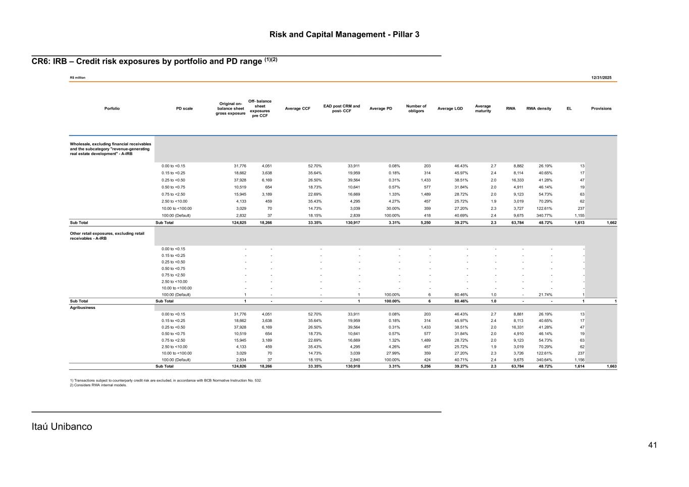 Risk and Capital Management - Pillar 3 __________________________________________________________________________________________ __________________________________________________________________________________________ Itaú Unibanco 41 CR6: IRB – Credit risk exposures by portfolio and PD range (1)(2) R$ million 12/31/2025 Porfolio PD scale Original on- balance sheet gross exposure Off- balance sheet exposures pre CCF Average CCF EAD post CRM and post- CCF Average PD Number of obligors Average LGD Average maturity RWA RWA density EL Provisions Wholesale, excluding financial receivables and the subcategory "revenue-generating real estate development" - A-IRB 0.00 to <0.15 31,776 4,051 52.70% 33,911 0.08% 203 46.43% 2.7 8,882 26.19% 13 0.15 to <0.25 18,662 3,638 35.64% 19,959 0.18% 314 45.97% 2.4 8,114 40.65% 17 0.25 to <0.50 37,928 6,169 26.50% 39,564 0.31% 1,433 38.51% 2.0 16,333 41.28% 47 0.50 to <0.75 10,519 654 18.73% 10,641 0.57% 577 31.84% 2.0 4,911 46.14% 19 0.75 to <2.50 15,945 3,189 22.69% 16,669 1.33% 1,489 28.72% 2.0 9,123 54.73% 63 2.50 to <10.00 4,133 459 35.43% 4,295 4.27% 457 25.72% 1.9 3,019 70.29% 62 10.00 to <100.00 3,029 70 14.73% 3,039 30.00% 359 27.20% 2.3 3,727 122.61% 237 100.00 (Default) 2,832 37 18.15% 2,839 100.00% 418 40.69% 2.4 9,675 340.77% 1,155 Sub Total Sub Total 124,825 18,266 33.35% 130,917 3.31% 5,250 39.27% 2.3 63,784 48.72% 1,613 1,662 Other retail exposures, excluding retail receivables - A-IRB 0.00 to <0.15 - - - - - - - - - - - 0.15 to <0.25 - - - - - - - - - - - 0.25 to <0.50 - - - - - - - - - - - 0.50 to <0.75 - - - - - - - - - - - 0.75 to <2.50 - - - - - - - - - - - 2.50 to <10.00 - - - - - - - - - - - 10.00 to <100.00 - - - - - - - - - - - 100.00 (Default) 1 - - 1 100.00% 6 80.46% 1.0 - 21.74% 1 Sub Total Sub Total 1 - - 1 100.00% 6 80.46% 1.0 - - 1 1 Agribusiness 0.00 to <0.15 31,776 4,051 52.70% 33,911 0.08% 203 46.43% 2.7 8,881 26.19% 13 0.15 to <0.25 18,662 3,638 35.64% 19,959 0.18% 314 45.97% 2.4 8,113 40.65% 17 0.25 to <0.50 37,928 6,169 26.50% 39,564 0.31% 1,433 38.51% 2.0 16,331 41.28% 47 0.50 to <0.75 10,519 654 18.73% 10,641 0.57% 577 31.84% 2.0 4,910 46.14% 19 0.75 to <2.50 15,945 3,189 22.69% 16,669 1.32% 1,489 28.72% 2.0 9,123 54.73% 63 2.50 to <10.00 4,133 459 35.43% 4,295 4.26% 457 25.72% 1.9 3,019 70.29% 62 10.00 to <100.00 3,029 70 14.73% 3,039 27.99% 359 27.20% 2.3 3,726 122.61% 237 100.00 (Default) 2,834 37 18.15% 2,840 100.00% 424 40.71% 2.4 9,675 340.64% 1,156 Sub Total 124,826 18,266 33.35% 130,918 3.31% 5,256 39.27% 2.3 63,784 48.72% 1,614 1,663 1) Transactions subject to counterparty credit risk are excluded, in accordance with BCB Normative Instruction No. 532. 2) Considers RWA internal models.