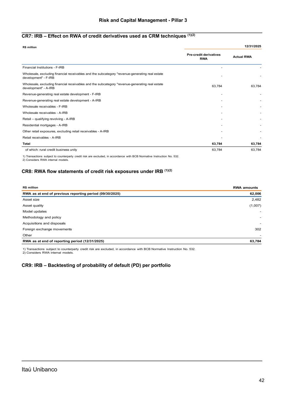 Risk and Capital Management - Pillar 3 __________________________________________________________________________________________ __________________________________________________________________________________________ Itaú Unibanco 42 CR7: IRB – Effect on RWA of credit derivatives used as CRM techniques (1)(2) R$ million 12/31/2025 Pre-credit derivatives RWA Actual RWA Financial Institutions - F-IRB - - Wholesale, excluding financial receivables and the subcategory "revenue-generating real estate development" - F-IRB - - Wholesale, excluding financial receivables and the subcategory "revenue-generating real estate development" - A-IRB 63,784 63,784 Revenue-generating real estate development - F-IRB - - Revenue-generating real estate development - A-IRB - - Wholesale receivables - F-IRB - - Wholesale receivables - A-IRB - - Retail – qualifying revolving - A-IRB - - Residential mortgages - A-IRB - - Other retail exposures, excluding retail receivables - A-IRB - - Retail receivables - A-IRB - - Total 63,784 63,784 of which: rural credit business unity 63,784 63,784 1) Transactions subject to counterparty credit risk are excluded, in accordance with BCB Normative Instruction No. 532. 2) Considers RWA internal models. CR8: RWA flow statements of credit risk exposures under IRB (1)(2) a R$ million RWA amounts RWA as at end of previous reporting period (09/30/2025) 09/30/2025 62,006 Asset size 2,482 Asset quality (1,007) Model updates - Methodology and policy - Acquisitions and disposals - Foreign exchange movements 302 Other - RWA as at end of reporting period (12/31/2025) 12/31/2025 63,784 1) Transactions subject to counterparty credit risk are excluded, in accordance with BCB Normative Instruction No. 532. 2) Considers RWA internal models. CR9: IRB – Backtesting of probability of default (PD) per portfolio