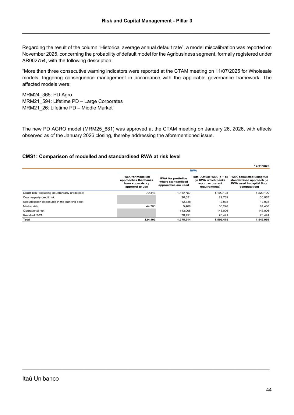 Risk and Capital Management - Pillar 3 __________________________________________________________________________________________ __________________________________________________________________________________________ Itaú Unibanco 44 Regarding the result of the column “Historical average annual default rate”, a model miscalibration was reported on November 2025, concerning the probability of default model for the Agribusiness segment, formally registered under AR002754, with the following description: “More than three consecutive warning indicators were reported at the CTAM meeting on 11/07/2025 for Wholesale models, triggering consequence management in accordance with the applicable governance framework. The affected models were: MRM24_365: PD Agro MRM21_594: Lifetime PD – Large Corporates MRM21_26: Lifetime PD – Middle Market” The new PD AGRO model (MRM25_681) was approved at the CTAM meeting on January 26, 2026, with effects observed as of the January 2026 closing, thereby addressing the aforementioned issue. CMS1: Comparison of modelled and standardised RWA at risk level 12/31/2025 RWA RWA for modelled approaches that banks have supervisory approval to use RWA for portfolios where standardised approaches are used Total Actual RWA (a + b) (ie RWA which banks report as current requirements) RWA calculated using full standardised approach (ie RWA used in capital floor computation) Credit risk (excluding counterparty credit risk) 79,343 1,119,760 1,199,103 1,229,199 Counterparty credit risk 26,631 29,789 30,987 Securitisation exposures in the banking book 12,838 12,838 12,838 Market risk 44,760 5,488 50,248 61,438 Operational risk 143,006 143,006 143,006 Residual RWA 70,491 70,491 70,491 Total 124,103 1,378,214 1,505,475 1,547,959