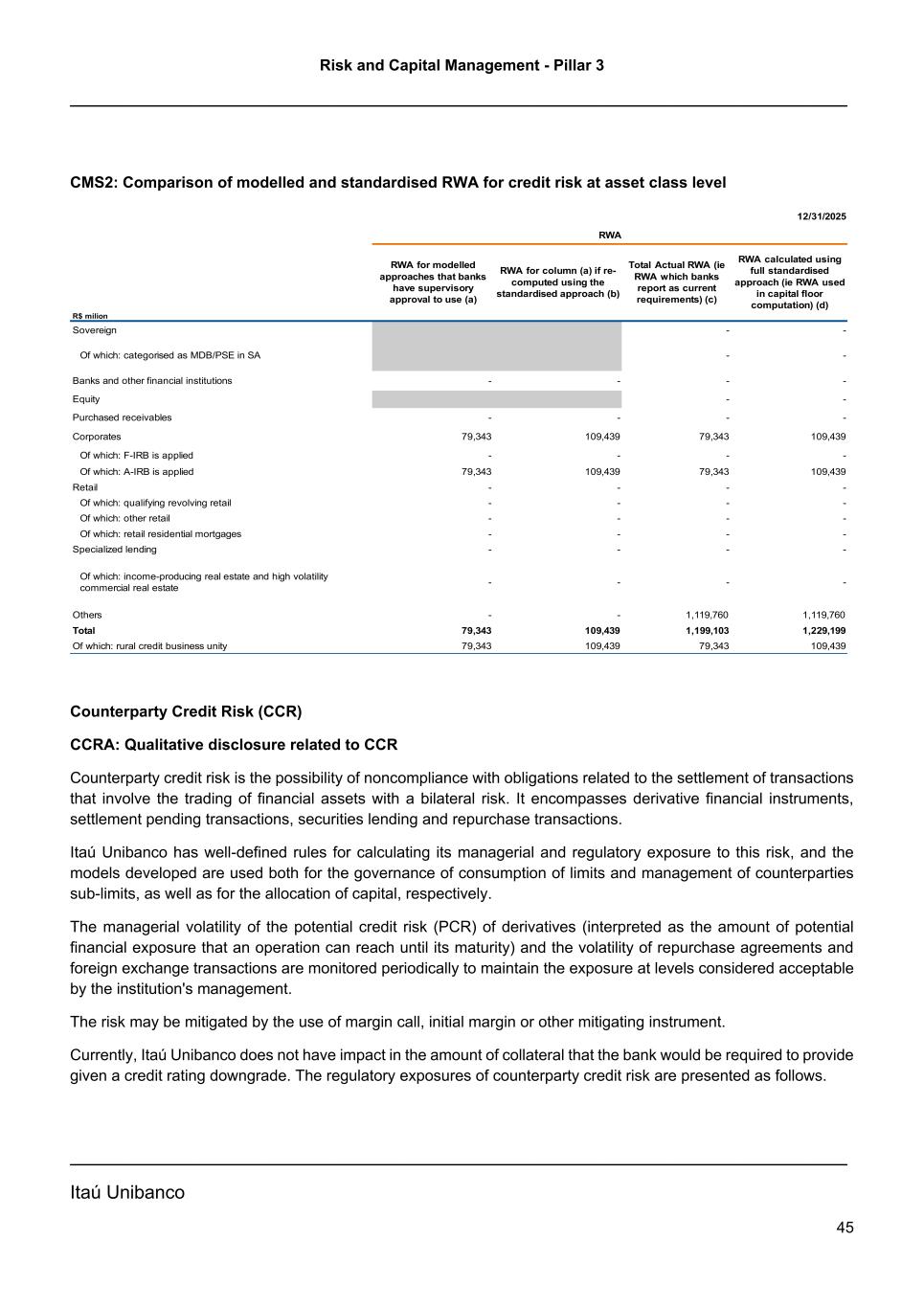 Risk and Capital Management - Pillar 3 __________________________________________________________________________________________ __________________________________________________________________________________________ Itaú Unibanco 45 CMS2: Comparison of modelled and standardised RWA for credit risk at asset class level 12/31/2025 RWA R$ milion RWA for modelled approaches that banks have supervisory approval to use (a) RWA for column (a) if re- computed using the standardised approach (b) Total Actual RWA (ie RWA which banks report as current requirements) (c) RWA calculated using full standardised approach (ie RWA used in capital floor computation) (d) Sovereign - - Of which: categorised as MDB/PSE in SA - - Banks and other financial institutions - - - - Equity - - Purchased receivables - - - - Corporates 79,343 109,439 79,343 109,439 Of which: F-IRB is applied - - - - Of which: A-IRB is applied 79,343 109,439 79,343 109,439 Retail - - - - Of which: qualifying revolving retail - - - - Of which: other retail - - - - Of which: retail residential mortgages - - - - Specialized lending - - - - Of which: income-producing real estate and high volatility commercial real estate - - - - Others - - 1,119,760 1,119,760 Total 79,343 109,439 1,199,103 1,229,199 Of which: rural credit business unity 79,343 109,439 79,343 109,439 Counterparty Credit Risk (CCR) CCRA: Qualitative disclosure related to CCR Counterparty credit risk is the possibility of noncompliance with obligations related to the settlement of transactions that involve the trading of financial assets with a bilateral risk. It encompasses derivative financial instruments, settlement pending transactions, securities lending and repurchase transactions. Itaú Unibanco has well-defined rules for calculating its managerial and regulatory exposure to this risk, and the models developed are used both for the governance of consumption of limits and management of counterparties sub-limits, as well as for the allocation of capital, respectively. The managerial volatility of the potential credit risk (PCR) of derivatives (interpreted as the amount of potential financial exposure that an operation can reach until its maturity) and the volatility of repurchase agreements and foreign exchange transactions are monitored periodically to maintain the exposure at levels considered acceptable by the institution's management. The risk may be mitigated by the use of margin call, initial margin or other mitigating instrument. Currently, Itaú Unibanco does not have impact in the amount of collateral that the bank would be required to provide given a credit rating downgrade. The regulatory exposures of counterparty credit risk are presented as follows.