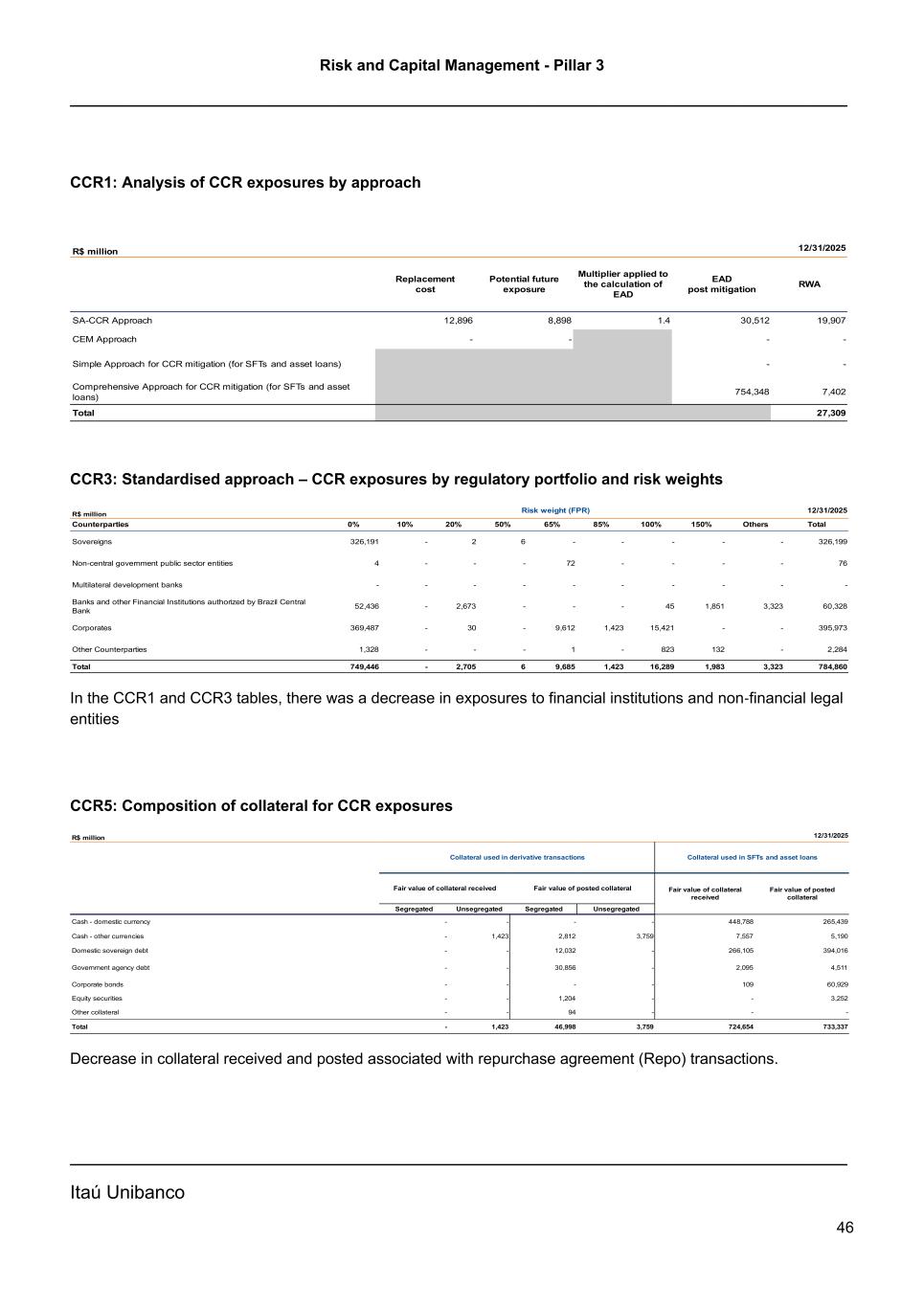 Risk and Capital Management - Pillar 3 __________________________________________________________________________________________ __________________________________________________________________________________________ Itaú Unibanco 46 CCR1: Analysis of CCR exposures by approach R$ million 12/31/2025 Replacement cost Potential future exposure Multiplier applied to the calculation of EAD EAD post mitigation RWA SA-CCR Approach 12,896 8,898 1.4 30,512 19,907 CEM Approach - - - - Simple Approach for CCR mitigation (for SFTs and asset loans) - - Comprehensive Approach for CCR mitigation (for SFTs and asset loans) 754,348 7,402 Total 27,309 CCR3: Standardised approach – CCR exposures by regulatory portfolio and risk weights R$ million Risk weight (FPR) 12/31/2025 Counterparties 0% 10% 20% 50% 65% 85% 100% 150% Others Total Sovereigns 326,191 - 2 6 - - - - - 326,199 Non-central government public sector entities 4 - - - 72 - - - - 76 Multilateral development banks - - - - - - - - - - Banks and other Financial Institutions authorized by Brazil Central Bank 52,436 - 2,673 - - - 45 1,851 3,323 60,328 Corporates 369,487 - 30 - 9,612 1,423 15,421 - - 395,973 Other Counterparties 1,328 - - - 1 - 823 132 - 2,284 Total 749,446 - 2,705 6 9,685 1,423 16,289 1,983 3,323 784,860 In the CCR1 and CCR3 tables, there was a decrease in exposures to financial institutions and non‑financial legal entities CCR5: Composition of collateral for CCR exposures R$ million 12/31/2025 Collateral used in derivative transactions Collateral used in SFTs and asset loans Fair value of collateral received Fair value of posted collateral Fair value of collateral received Fair value of posted collateral Segregated Unsegregated Segregated Unsegregated Cash - domestic currency - - - - 448,788 265,439 Cash - other currencies - 1,423 2,812 3,759 7,557 5,190 Domestic sovereign debt - - 12,032 - 266,105 394,016 Government agency debt - - 30,856 - 2,095 4,511 Corporate bonds - - - - 109 60,929 Equity securities - - 1,204 - - 3,252 Other collateral - - 94 - - - Total - 1,423 46,998 3,759 724,654 733,337 Decrease in collateral received and posted associated with repurchase agreement (Repo) transactions.