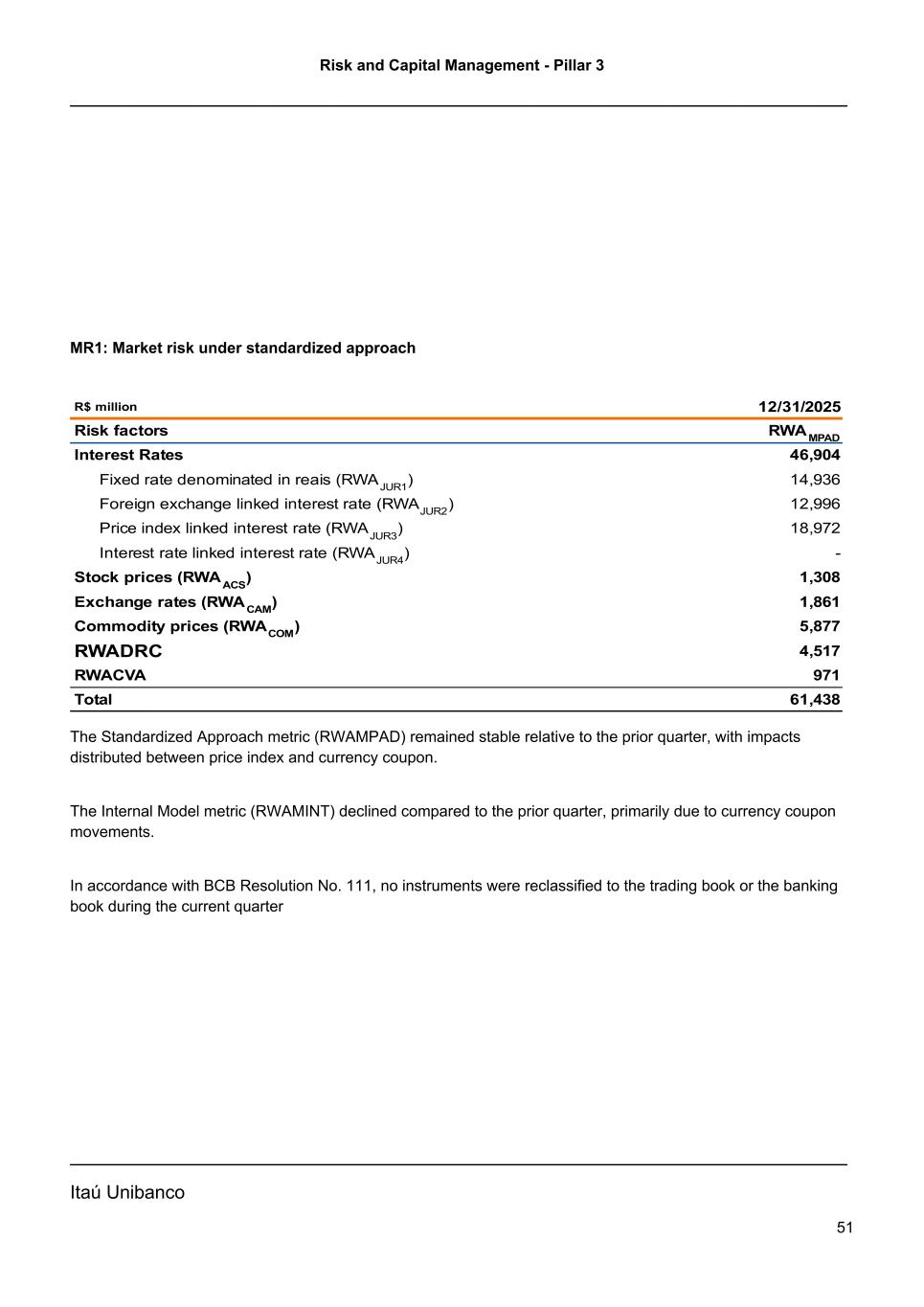 Risk and Capital Management - Pillar 3 __________________________________________________________________________________________ __________________________________________________________________________________________ Itaú Unibanco 51 MR1: Market risk under standardized approach R$ million 12/31/2025 Risk factors RWA MPAD Interest Rates 46,904 Fixed rate denominated in reais (RWA JUR1 ) 14,936 Foreign exchange linked interest rate (RWA JUR2 ) 12,996 Price index linked interest rate (RWA JUR3 ) 18,972 Interest rate linked interest rate (RWA JUR4 ) - Stock prices (RWA ACS ) 1,308 Exchange rates (RWA CAM ) 1,861 Commodity prices (RWA COM ) 5,877 RWADRC 4,517 RWACVA 971 Total 61,438 The Standardized Approach metric (RWAMPAD) remained stable relative to the prior quarter, with impacts distributed between price index and currency coupon. The Internal Model metric (RWAMINT) declined compared to the prior quarter, primarily due to currency coupon movements. In accordance with BCB Resolution No. 111, no instruments were reclassified to the trading book or the banking book during the current quarter