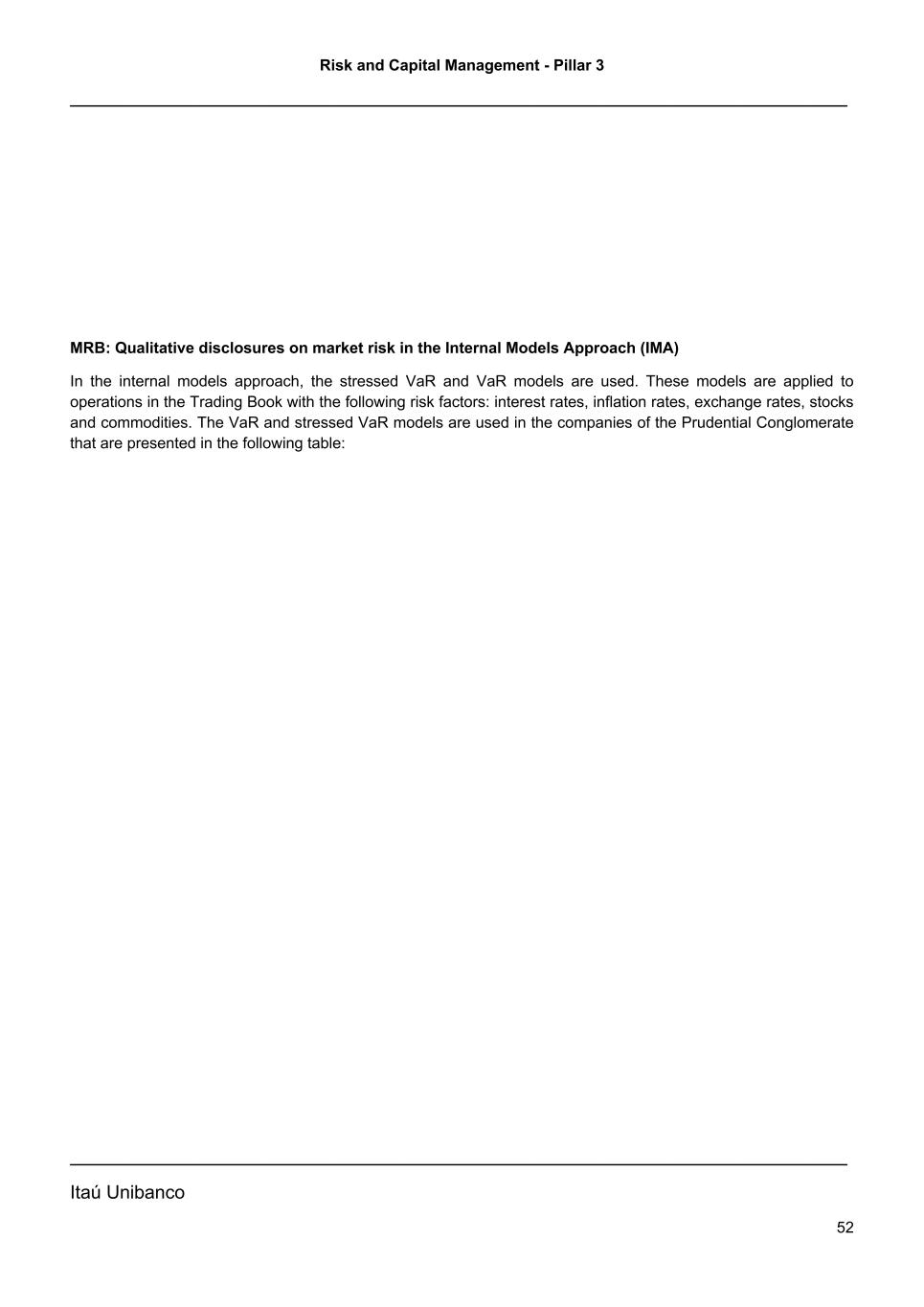 Risk and Capital Management - Pillar 3 __________________________________________________________________________________________ __________________________________________________________________________________________ Itaú Unibanco 52 MRB: Qualitative disclosures on market risk in the Internal Models Approach (IMA) In the internal models approach, the stressed VaR and VaR models are used. These models are applied to operations in the Trading Book with the following risk factors: interest rates, inflation rates, exchange rates, stocks and commodities. The VaR and stressed VaR models are used in the companies of the Prudential Conglomerate that are presented in the following table: