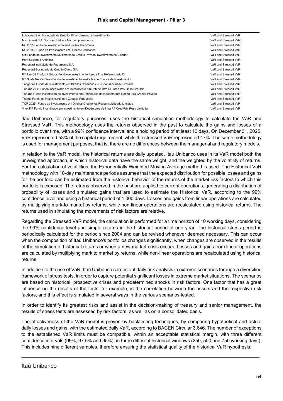 Risk and Capital Management - Pillar 3 __________________________________________________________________________________________ __________________________________________________________________________________________ Itaú Unibanco 54 Itaú Unibanco, for regulatory purposes, uses the historical simulation methodology to calculate the VaR and Stressed VaR. This methodology uses the returns observed in the past to calculate the gains and losses of a portfolio over time, with a 99% confidence interval and a holding period of at least 10 days. On December 31, 2025, VaR represented 53% of the capital requirement, while the stressed VaR represented 47%. The same methodology is used for management purposes, that is, there are no differences between the managerial and regulatory models. In relation to the VaR model, the historical returns are daily updated. Itaú Unibanco uses in its VaR model both the unweighted approach, in which historical data have the same weight, and the weighted by the volatility of returns. For the calculation of volatilities, the Exponentially Weighted Moving Average method is used. The Historical VaR methodology with 10-day maintenance periods assumes that the expected distribution for possible losses and gains for the portfolio can be estimated from the historical behavior of the returns of the market risk factors to which this portfolio is exposed. The returns observed in the past are applied to current operations, generating a distribution of probability of losses and simulated gains that are used to estimate the Historical VaR, according to the 99% confidence level and using a historical period of 1,000 days. Losses and gains from linear operations are calculated by multiplying mark-to-market by returns, while non-linear operations are recalculated using historical returns. The returns used in simulating the movements of risk factors are relative. Regarding the Stressed VaR model, the calculation is performed for a time horizon of 10 working days, considering the 99% confidence level and simple returns in the historical period of one year. The historical stress period is periodically calculated for the period since 2004 and can be revised whenever deemed necessary. This can occur when the composition of Itaú Unibanco's portfolios changes significantly, when changes are observed in the results of the simulation of historical returns or when a new market crisis occurs. Losses and gains from linear operations are calculated by multiplying mark to market by returns, while non-linear operations are recalculated using historical returns. In addition to the use of VaR, Itaú Unibanco carries out daily risk analysis in extreme scenarios through a diversified framework of stress tests, in order to capture potential significant losses in extreme market situations. The scenarios are based on historical, prospective crises and predetermined shocks in risk factors. One factor that has a great influence on the results of the tests, for example, is the correlation between the assets and the respective risk factors, and this effect is simulated in several ways in the various scenarios tested. In order to identify its greatest risks and assist in the decision-making of treasury and senior management, the results of stress tests are assessed by risk factors, as well as on a consolidated basis. The effectiveness of the VaR model is proven by backtesting techniques, by comparing hypothetical and actual daily losses and gains, with the estimated daily VaR, according to BACEN Circular 3,646. The number of exceptions to the established VaR limits must be compatible, within an acceptable statistical margin, with three different confidence intervals (99%, 97.5% and 95%), in three different historical windows (250, 500 and 750 working days). This includes nine different samples, therefore ensuring the statistical quality of the historical VaR hypothesis. Luizacred S.A. Sociedade de Crédito, Financiamento e Investimento VaR and Stressed VaR Microinvest S.A. Soc. de Crédito a Microempreendedor VaR and Stressed VaR NC 2025 Fundo de Investimento em Direitos Creditórios VaR and Stressed VaR NC 2025 I Fundo de Investimento em Direitos Creditórios VaR and Stressed VaR Oiti Fundo de Investimento Multimercado Crédito Privado Investimento no Exterior VaR and Stressed VaR Pont Sociedad Anónima VaR and Stressed VaR Redecard Instituição de Pagamento S.A. VaR and Stressed VaR Redecard Sociedade de Crédito Direto S.A VaR and Stressed VaR RT Itaú DJ Títulos Públicos Fundo de Investimento Renda Fixa Referenciado DI VaR and Stressed VaR RT Scala Renda Fixa - Fundo de Investimento em Cotas de Fundos de Investimento VaR and Stressed VaR Tangerina Fundo de Investimento em Direitos Creditórios - Responsabilidade Limitada VaR and Stressed VaR Tarumã 2 FIF Fundo Incentivado em Investimento em Deb de Infra RF Cred Priv Resp Limitada VaR and Stressed VaR Tarumã Fundo Incentivado de Investimento em Debêntures de Infraestrutura Renda Fixa Crédito Privado VaR and Stressed VaR Théros Fundo de Investimento nas Cadeias Produtivas VaR and Stressed VaR TOP 2025 I Fundo de Investimento em Direitos Creditórios Responsabilidade Limitada VaR and Stressed VaR Vitex FIF Fundo Incentivado em Investimento em Debêntures de Infra RF Cred Priv Resp Limitada VaR and Stressed VaR