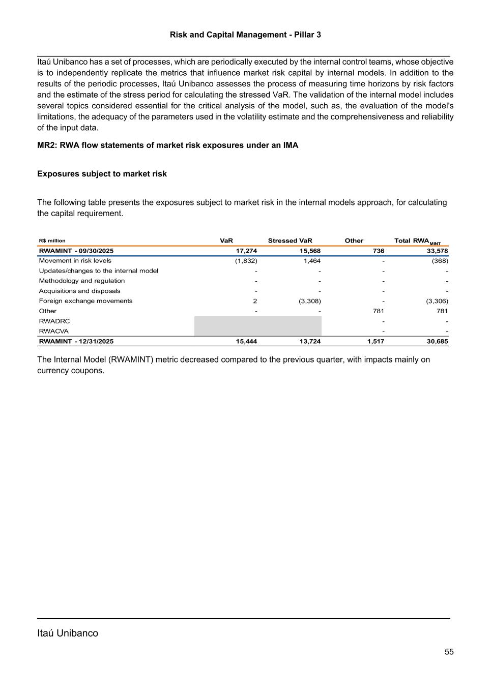 Risk and Capital Management - Pillar 3 __________________________________________________________________________________________ __________________________________________________________________________________________ Itaú Unibanco 55 Itaú Unibanco has a set of processes, which are periodically executed by the internal control teams, whose objective is to independently replicate the metrics that influence market risk capital by internal models. In addition to the results of the periodic processes, Itaú Unibanco assesses the process of measuring time horizons by risk factors and the estimate of the stress period for calculating the stressed VaR. The validation of the internal model includes several topics considered essential for the critical analysis of the model, such as, the evaluation of the model's limitations, the adequacy of the parameters used in the volatility estimate and the comprehensiveness and reliability of the input data. MR2: RWA flow statements of market risk exposures under an IMA Exposures subject to market risk The following table presents the exposures subject to market risk in the internal models approach, for calculating the capital requirement. a b e f R$ million VaR Stressed VaR Other Total RWA MINT RWAMINT - 09/30/2025 30/09/2025 17,274 15,568 736 33,578 Movement in risk levels (1,832) 1,464 - (368) Updates/changes to the internal model - - - - Methodology and regulation - - - - Acquisitions and disposals - - - - Foreign exchange movements 2 (3,308) - (3,306) Other - - 781 781 RWADRC - - RWACVA - - RWAMINT - 12/31/2025 31/12/2025 15,444 13,724 1,517 30,685 The Internal Model (RWAMINT) metric decreased compared to the previous quarter, with impacts mainly on currency coupons.