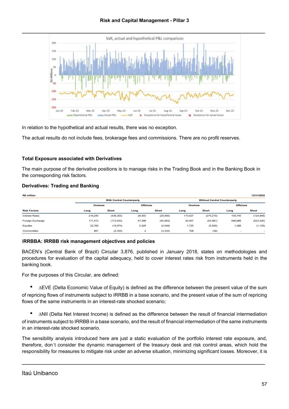 Risk and Capital Management - Pillar 3 __________________________________________________________________________________________ __________________________________________________________________________________________ Itaú Unibanco 57 In relation to the hypothetical and actual results, there was no exception. The actual results do not include fees, brokerage fees and commissions. There are no profit reserves. Total Exposure associated with Derivatives The main purpose of the derivative positions is to manage risks in the Trading Book and in the Banking Book in the corresponding risk factors. Derivatives: Trading and Banking R$ million 12/31/2025 With Central Counterparty Without Central Counterparty Onshore Offshore Onshore Offshore Risk Factors Long Short Long Short Long Short Long Short Interest Rates 216,240 (436,303) 26,503 (25,655) 173,427 (275,215) 105,745 (124,946) Foreign Exchange 171,413 (172,533) 47,299 (40,693) 30,407 (53,961) 596,988 (523,320) Equities 22,760 (19,974) 5,329 (4,049) 1,725 (5,500) 1,288 (1,105) Commodities 891 (2,303) 2 (3,333) 708 (38) - - IRRBBA: IRRBB risk management objectives and policies BACEN’s (Central Bank of Brazil) Circular 3,876, published in January 2018, states on methodologies and procedures for evaluation of the capital adequacy, held to cover interest rates risk from instruments held in the banking book. For the purposes of this Circular, are defined: • ∆EVE (Delta Economic Value of Equity) is defined as the difference between the present value of the sum of repricing flows of instruments subject to IRRBB in a base scenario, and the present value of the sum of repricing flows of the same instruments in an interest-rate shocked scenario; • ∆NII (Delta Net Interest Income) is defined as the difference between the result of financial intermediation of instruments subject to IRRBB in a base scenario, and the result of financial intermediation of the same instruments in an interest-rate shocked scenario. The sensibility analysis introduced here are just a static evaluation of the portfolio interest rate exposure, and, therefore, don´t consider the dynamic management of the treasury desk and risk control areas, which hold the responsibility for measures to mitigate risk under an adverse situation, minimizing significant losses. Moreover, it is
