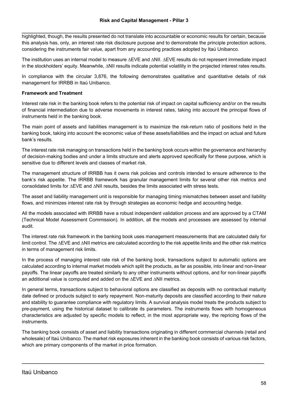 Risk and Capital Management - Pillar 3 __________________________________________________________________________________________ __________________________________________________________________________________________ Itaú Unibanco 58 highlighted, though, the results presented do not translate into accountable or economic results for certain, because this analysis has, only, an interest rate risk disclosure purpose and to demonstrate the principle protection actions, considering the instruments fair value, apart from any accounting practices adopted by Itaú Unibanco. The institution uses an internal model to measure ∆EVE and ∆NII. ∆EVE results do not represent immediate impact in the stockholders’ equity. Meanwhile, ∆NII results indicate potential volatility in the projected interest rates results. In compliance with the circular 3,876, the following demonstrates qualitative and quantitative details of risk management for IRRBB in Itaú Unibanco. Framework and Treatment Interest rate risk in the banking book refers to the potential risk of impact on capital sufficiency and/or on the results of financial intermediation due to adverse movements in interest rates, taking into account the principal flows of instruments held in the banking book. The main point of assets and liabilities management is to maximize the risk-return ratio of positions held in the banking book, taking into account the economic value of these assets/liabilities and the impact on actual and future bank’s results. The interest rate risk managing on transactions held in the banking book occurs within the governance and hierarchy of decision-making bodies and under a limits structure and alerts approved specifically for these purpose, which is sensitive due to different levels and classes of market risk. The management structure of IRRBB has it owns risk policies and controls intended to ensure adherence to the bank’s risk appetite. The IRRBB framework has granular management limits for several other risk metrics and consolidated limits for ∆EVE and ∆NII results, besides the limits associated with stress tests. The asset and liability management unit is responsible for managing timing mismatches between asset and liability flows, and minimizes interest rate risk by through strategies as economic hedge and accounting hedge. All the models associated with IRRBB have a robust independent validation process and are approved by a CTAM (Technical Model Assessment Commission). In addition, all the models and processes are assessed by internal audit. The interest rate risk framework in the banking book uses management measurements that are calculated daily for limit control. The ∆EVE and ∆NII metrics are calculated according to the risk appetite limits and the other risk metrics in terms of management risk limits. In the process of managing interest rate risk of the banking book, transactions subject to automatic options are calculated according to internal market models which split the products, as far as possible, into linear and non-linear payoffs. The linear payoffs are treated similarly to any other instruments without options, and for non-linear payoffs an additional value is computed and added on the ∆EVE and ∆NII metrics. In general terms, transactions subject to behavioral options are classified as deposits with no contractual maturity date defined or products subject to early repayment. Non-maturity deposits are classified according to their nature and stability to guarantee compliance with regulatory limits. A survival analysis model treats the products subject to pre-payment, using the historical dataset to calibrate its parameters. The instruments flows with homogeneous characteristics are adjusted by specific models to reflect, in the most appropriate way, the repricing flows of the instruments. The banking book consists of asset and liability transactions originating in different commercial channels (retail and wholesale) of Itaú Unibanco. The market risk exposures inherent in the banking book consists of various risk factors, which are primary components of the market in price formation.