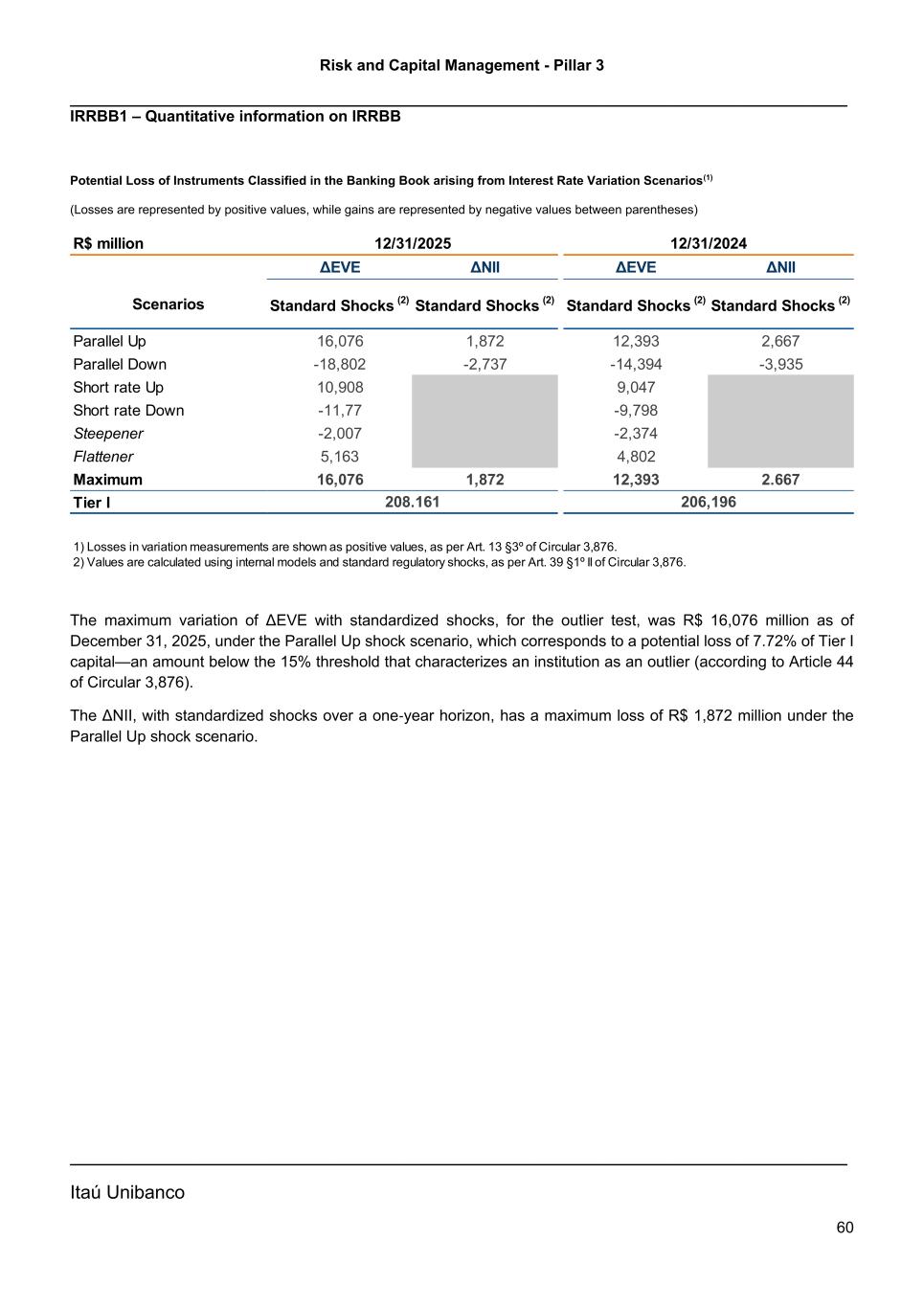 Risk and Capital Management - Pillar 3 __________________________________________________________________________________________ __________________________________________________________________________________________ Itaú Unibanco 60 IRRBB1 – Quantitative information on IRRBB Potential Loss of Instruments Classified in the Banking Book arising from Interest Rate Variation Scenarios(1) (Losses are represented by positive values, while gains are represented by negative values between parentheses) The maximum variation of ΔEVE with standardized shocks, for the outlier test, was R$ 16,076 million as of December 31, 2025, under the Parallel Up shock scenario, which corresponds to a potential loss of 7.72% of Tier I capital—an amount below the 15% threshold that characterizes an institution as an outlier (according to Article 44 of Circular 3,876). The ΔNII, with standardized shocks over a one‑year horizon, has a maximum loss of R$ 1,872 million under the Parallel Up shock scenario. R$ million ΔEVE ΔNII ΔEVE ΔNII Parallel Up 16,076 1,872 12,393 2,667 Parallel Down -18,802 -2,737 -14,394 -3,935 Short rate Up 10,908 9,047 Short rate Down -11,77 -9,798 Steepener -2,007 -2,374 Flattener 5,163 4,802 Maximum 16,076 1,872 12,393 2.667 Tier I 208.161 206,196 1) Losses in variation measurements are shown as positive values, as per Art. 13 §3º of Circular 3,876. 2) Values are calculated using internal models and standard regulatory shocks, as per Art. 39 §1º II of Circular 3,876. 12/31/2025 12/31/2024 Scenarios Standard Shocks (2) Standard Shocks (2) Standard Shocks (2) Standard Shocks (2)
