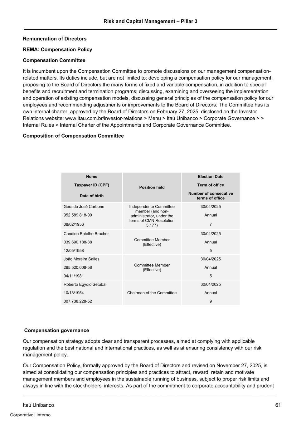 Risk and Capital Management – Pillar 3 __________________________________________________________________________________________ __________________________________________________________________________________________ Itaú Unibanco 61 Corporativo | Interno Remuneration of Directors REMA: Compensation Policy Compensation Committee It is incumbent upon the Compensation Committee to promote discussions on our management compensation- related matters. Its duties include, but are not limited to: developing a compensation policy for our management, proposing to the Board of Directors the many forms of fixed and variable compensation, in addition to special benefits and recruitment and termination programs; discussing, examining and overseeing the implementation and operation of existing compensation models, discussing general principles of the compensation policy for our employees and recommending adjustments or improvements to the Board of Directors. The Committee has its own internal charter, approved by the Board of Directors on February 27, 2025, disclosed on the Investor Relations website: www.itau.com.br/investor-relations > Menu > Itaú Unibanco > Corporate Governance > > Internal Rules > Internal Charter of the Appointments and Corporate Governance Committee. Composition of Compensation Committee Nome Position held Election Date Taxpayer ID (CPF) Term of office Date of birth Number of consecutive terms of office Geraldo José Carbone Independente Committee member (and non- administrator, under the terms of CMN Resolution 5.177) 30/04/2025 952.589.818-00 Annual 08/02/1956 7 Candido Botelho Bracher Committee Member (Effective) 30/04/2025 039.690.188-38 Annual 12/05/1958 5 João Moreira Salles Committee Member (Effective) 30/04/2025 295.520.008-58 Annual 04/11/1981 5 Roberto Egydio Setubal Chairman of the Committee 30/04/2025 10/13/1954 Annual 007.738.228-52 9 Compensation governance Our compensation strategy adopts clear and transparent processes, aimed at complying with applicable regulation and the best national and international practices, as well as at ensuring consistency with our risk management policy. Our Compensation Policy, formally approved by the Board of Directors and revised on November 27, 2025, is aimed at consolidating our compensation principles and practices to attract, reward, retain and motivate management members and employees in the sustainable running of business, subject to proper risk limits and always in line with the stockholders’ interests. As part of the commitment to corporate accountability and prudent