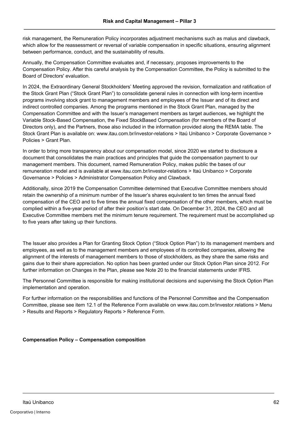 Risk and Capital Management – Pillar 3 __________________________________________________________________________________________ __________________________________________________________________________________________ Itaú Unibanco 62 Corporativo | Interno risk management, the Remuneration Policy incorporates adjustment mechanisms such as malus and clawback, which allow for the reassessment or reversal of variable compensation in specific situations, ensuring alignment between performance, conduct, and the sustainability of results. Annually, the Compensation Committee evaluates and, if necessary, proposes improvements to the Compensation Policy. After this careful analysis by the Compensation Committee, the Policy is submitted to the Board of Directors' evaluation. In 2024, the Extraordinary General Stockholders’ Meeting approved the revision, formalization and ratification of the Stock Grant Plan (“Stock Grant Plan”) to consolidate general rules in connection with long-term incentive programs involving stock grant to management members and employees of the Issuer and of its direct and indirect controlled companies. Among the programs mentioned in the Stock Grant Plan, managed by the Compensation Committee and with the Issuer’s management members as target audiences, we highlight the Variable Stock-Based Compensation, the Fixed StockBased Compensation (for members of the Board of Directors only), and the Partners, those also included in the information provided along the REMA table. The Stock Grant Plan is available on: www.itau.com.br/investor-relations > Itaú Unibanco > Corporate Governance > Policies > Grant Plan. In order to bring more transparency about our compensation model, since 2020 we started to disclosure a document that consolidates the main practices and principles that guide the compensation payment to our management members. This document, named Remuneration Policy, makes public the bases of our remuneration model and is available at www.itau.com.br/investor-relations > Itaú Unibanco > Corporate Governance > Policies > Administrator Compensation Policy and Clawback. Additionally, since 2019 the Compensation Committee determined that Executive Committee members should retain the ownership of a minimum number of the Issuer’s shares equivalent to ten times the annual fixed compensation of the CEO and to five times the annual fixed compensation of the other members, which must be complied within a five-year period of after their position’s start date. On December 31, 2024, the CEO and all Executive Committee members met the minimum tenure requirement. The requirement must be accomplished up to five years after taking up their functions. The Issuer also provides a Plan for Granting Stock Option (“Stock Option Plan”) to its management members and employees, as well as to the management members and employees of its controlled companies, allowing the alignment of the interests of management members to those of stockholders, as they share the same risks and gains due to their share appreciation. No option has been granted under our Stock Option Plan since 2012. For further information on Changes in the Plan, please see Note 20 to the financial statements under IFRS. The Personnel Committee is responsible for making institutional decisions and supervising the Stock Option Plan implementation and operation. For further information on the responsibilities and functions of the Personnel Committee and the Compensation Committee, please see item 12.1 of the Reference Form available on www.itau.com.br/investor.relations > Menu > Results and Reports > Regulatory Reports > Reference Form. Compensation Policy – Compensation composition