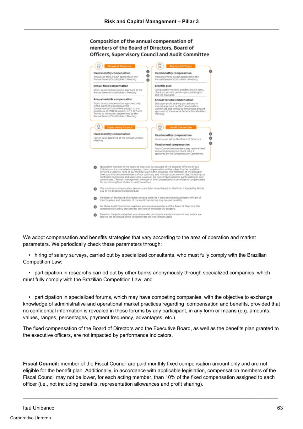 Risk and Capital Management – Pillar 3 __________________________________________________________________________________________ __________________________________________________________________________________________ Itaú Unibanco 63 Corporativo | Interno We adopt compensation and benefits strategies that vary according to the area of operation and market parameters. We periodically check these parameters through: • hiring of salary surveys, carried out by specialized consultants, who must fully comply with the Brazilian Competition Law; • participation in researchs carried out by other banks anonymously through specialized companies, which must fully comply with the Brazilian Competition Law; and • participation in specialized forums, which may have competing companies, with the objective to exchange knowledge of administrative and operational market practices regarding compensation and benefits, provided that no confidential information is revealed in these forums by any participant, in any form or means (e.g. amounts, values, ranges, percentages, payment frequency, advantages, etc.). The fixed compensation of the Board of Directors and the Executive Board, as well as the benefits plan granted to the executive officers, are not impacted by performance indicators. Fiscal Council: member of the Fiscal Council are paid monthly fixed compensation amount only and are not eligible for the benefit plan. Additionally, in accordance with applicable legislation, compensation members of the Fiscal Council may not be lower, for each acting member, than 10% of the fixed compensation assigned to each officer (i.e., not including benefits, representation allowances and profit sharing).