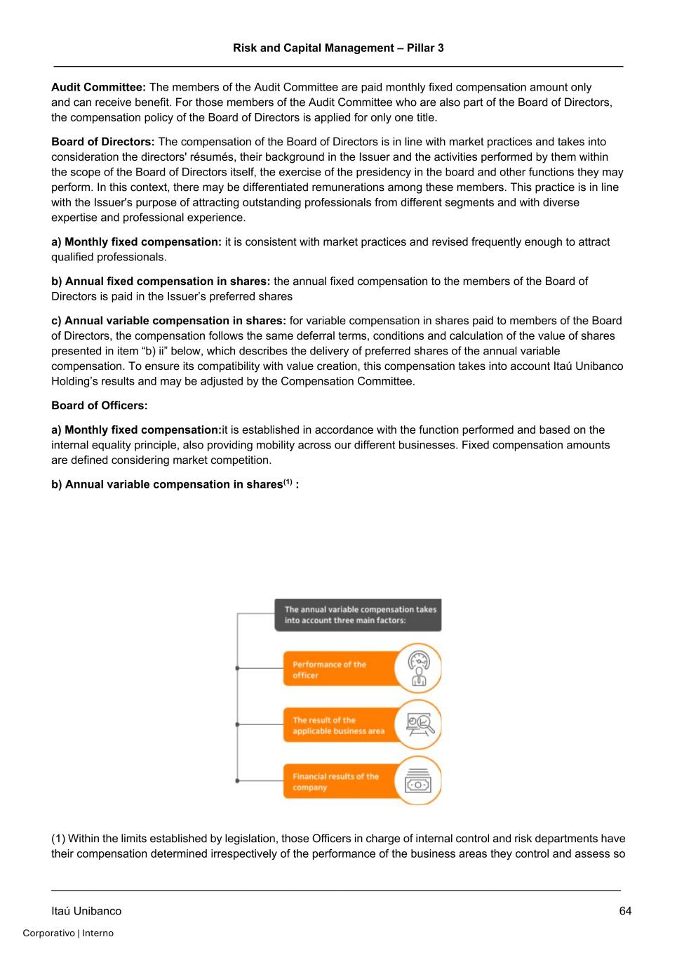 Risk and Capital Management – Pillar 3 __________________________________________________________________________________________ __________________________________________________________________________________________ Itaú Unibanco 64 Corporativo | Interno Audit Committee: The members of the Audit Committee are paid monthly fixed compensation amount only and can receive benefit. For those members of the Audit Committee who are also part of the Board of Directors, the compensation policy of the Board of Directors is applied for only one title. Board of Directors: The compensation of the Board of Directors is in line with market practices and takes into consideration the directors' résumés, their background in the Issuer and the activities performed by them within the scope of the Board of Directors itself, the exercise of the presidency in the board and other functions they may perform. In this context, there may be differentiated remunerations among these members. This practice is in line with the Issuer's purpose of attracting outstanding professionals from different segments and with diverse expertise and professional experience. a) Monthly fixed compensation: it is consistent with market practices and revised frequently enough to attract qualified professionals. b) Annual fixed compensation in shares: the annual fixed compensation to the members of the Board of Directors is paid in the Issuer’s preferred shares c) Annual variable compensation in shares: for variable compensation in shares paid to members of the Board of Directors, the compensation follows the same deferral terms, conditions and calculation of the value of shares presented in item “b) ii” below, which describes the delivery of preferred shares of the annual variable compensation. To ensure its compatibility with value creation, this compensation takes into account Itaú Unibanco Holding’s results and may be adjusted by the Compensation Committee. Board of Officers: a) Monthly fixed compensation:it is established in accordance with the function performed and based on the internal equality principle, also providing mobility across our different businesses. Fixed compensation amounts are defined considering market competition. b) Annual variable compensation in shares(1) : (1) Within the limits established by legislation, those Officers in charge of internal control and risk departments have their compensation determined irrespectively of the performance of the business areas they control and assess so