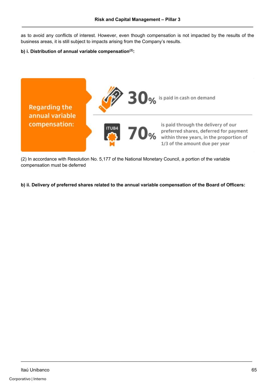 Risk and Capital Management – Pillar 3 __________________________________________________________________________________________ __________________________________________________________________________________________ Itaú Unibanco 65 Corporativo | Interno as to avoid any conflicts of interest. However, even though compensation is not impacted by the results of the business areas, it is still subject to impacts arising from the Company’s results. b) i. Distribution of annual variable compensation(2): (2) In accordance with Resolution No. 5,177 of the National Monetary Council, a portion of the variable compensation must be deferred b) ii. Delivery of preferred shares related to the annual variable compensation of the Board of Officers: