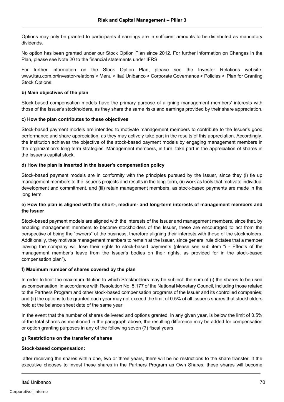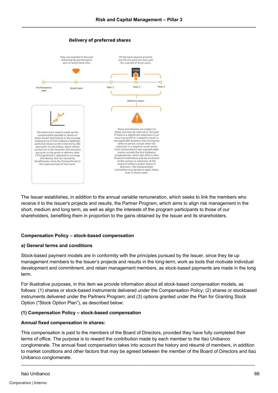 Risk and Capital Management – Pillar 3 __________________________________________________________________________________________ __________________________________________________________________________________________ Itaú Unibanco 66 Corporativo | Interno The Issuer establishes, in addition to the annual variable remuneration, which seeks to link the members who receive it to the Issuer's projects and results, the Partner Program, which aims to align risk management in the short, medium and long term, as well as align the interests of the program participants to those of our shareholders, benefiting them in proportion to the gains obtained by the Issuer and its shareholders. Compensation Policy – stock-based compensation a) General terms and conditions Stock-based payment models are in conformity with the principles pursued by the Issuer, since they tie up management members to the Issuer’s projects and results in the long-term, work as tools that motivate individual development and commitment, and retain management members, as stock-based payments are made in the long term. For illustrative purposes, in this item we provide information about all stock-based compensation models, as follows: (1) shares or stock-based instruments delivered under the Compensation Policy; (2) shares or stockbased instruments delivered under the Partners Program; and (3) options granted under the Plan for Granting Stock Option ("Stock Option Plan”), as described below: (1) Compensation Policy – stock-based compensation Annual fixed compensation in shares: This compensation is paid to the members of the Board of Directors, provided they have fully completed their terms of office. The purpose is to reward the contribution made by each member to the Itaú Unibanco conglomerate. The annual fixed compensation takes into account the history and résumé of members, in addition to market conditions and other factors that may be agreed between the member of the Board of Directors and Itaú Unibanco conglomerate.