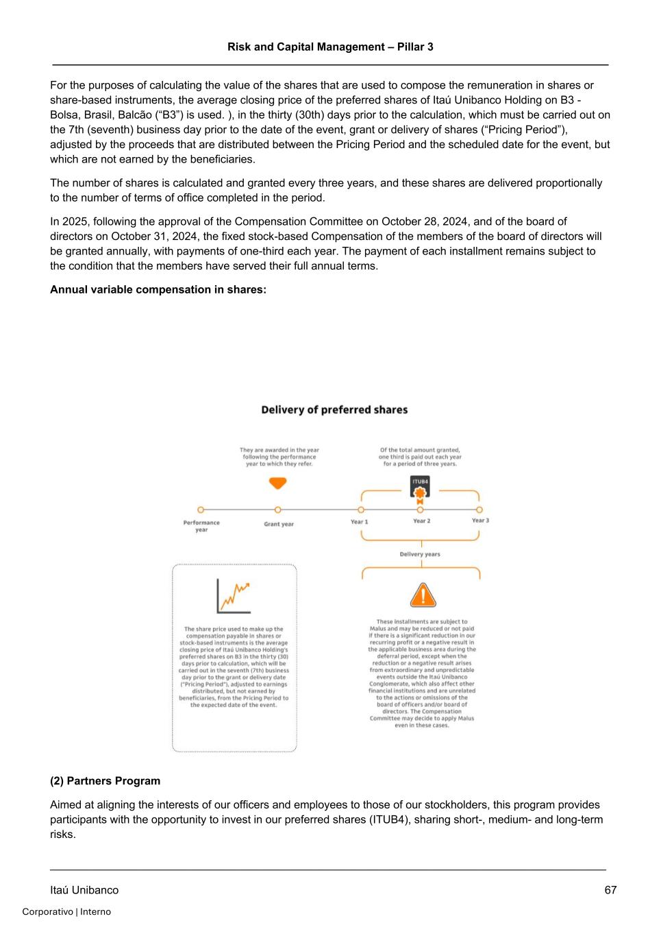Risk and Capital Management – Pillar 3 __________________________________________________________________________________________ __________________________________________________________________________________________ Itaú Unibanco 67 Corporativo | Interno For the purposes of calculating the value of the shares that are used to compose the remuneration in shares or share-based instruments, the average closing price of the preferred shares of Itaú Unibanco Holding on B3 - Bolsa, Brasil, Balcão (“B3”) is used. ), in the thirty (30th) days prior to the calculation, which must be carried out on the 7th (seventh) business day prior to the date of the event, grant or delivery of shares (“Pricing Period”), adjusted by the proceeds that are distributed between the Pricing Period and the scheduled date for the event, but which are not earned by the beneficiaries. The number of shares is calculated and granted every three years, and these shares are delivered proportionally to the number of terms of office completed in the period. In 2025, following the approval of the Compensation Committee on October 28, 2024, and of the board of directors on October 31, 2024, the fixed stock-based Compensation of the members of the board of directors will be granted annually, with payments of one-third each year. The payment of each installment remains subject to the condition that the members have served their full annual terms. Annual variable compensation in shares: (2) Partners Program Aimed at aligning the interests of our officers and employees to those of our stockholders, this program provides participants with the opportunity to invest in our preferred shares (ITUB4), sharing short-, medium- and long-term risks.