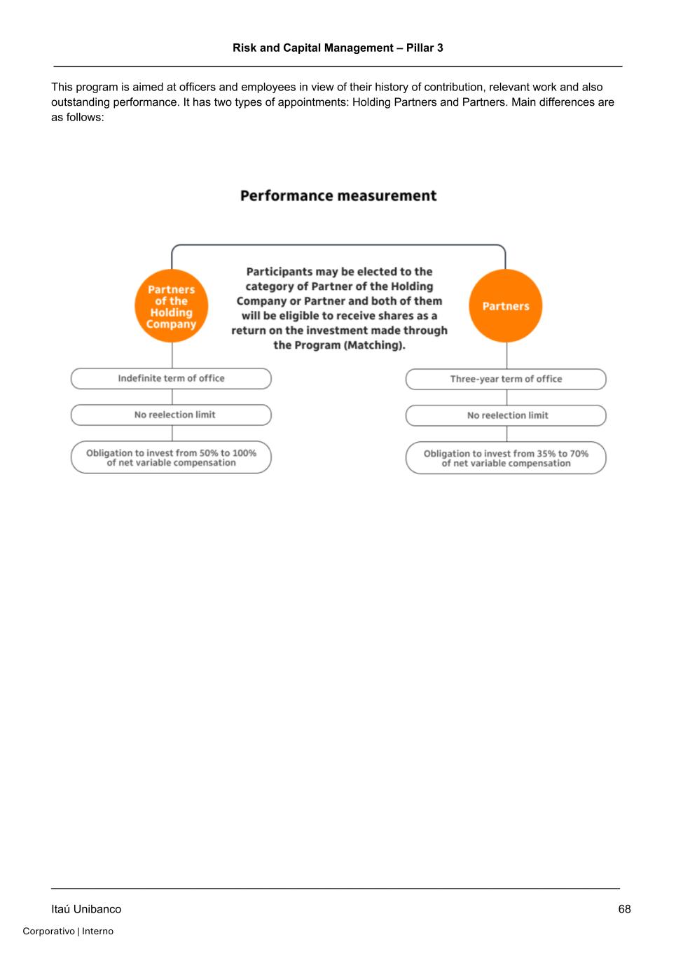 Risk and Capital Management – Pillar 3 __________________________________________________________________________________________ __________________________________________________________________________________________ Itaú Unibanco 68 Corporativo | Interno This program is aimed at officers and employees in view of their history of contribution, relevant work and also outstanding performance. It has two types of appointments: Holding Partners and Partners. Main differences are as follows: