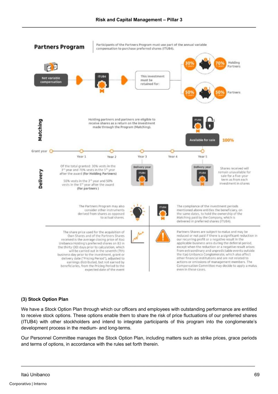 Risk and Capital Management – Pillar 3 __________________________________________________________________________________________ __________________________________________________________________________________________ Itaú Unibanco 69 Corporativo | Interno (3) Stock Option Plan We have a Stock Option Plan through which our officers and employees with outstanding performance are entitled to receive stock options. These options enable them to share the risk of price fluctuations of our preferred shares (ITUB4) with other stockholders and intend to integrate participants of this program into the conglomerate’s development process in the medium- and long-terms. Our Personnel Committee manages the Stock Option Plan, including matters such as strike prices, grace periods and terms of options, in accordance with the rules set forth therein.