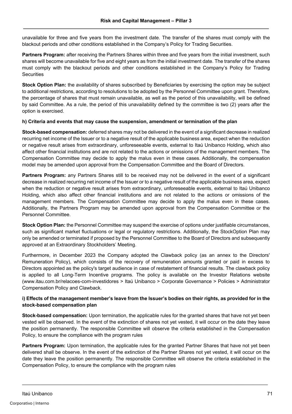 Risk and Capital Management – Pillar 3 __________________________________________________________________________________________ __________________________________________________________________________________________ Itaú Unibanco 71 Corporativo | Interno unavailable for three and five years from the investment date. The transfer of the shares must comply with the blackout periods and other conditions established in the Company’s Policy for Trading Securities. Partners Program: after receiving the Partners Shares within three and five years from the initial investment, such shares will become unavailable for five and eight years as from the initial investment date. The transfer of the shares must comply with the blackout periods and other conditions established in the Company’s Policy for Trading Securities Stock Option Plan: the availability of shares subscribed by Beneficiaries by exercising the option may be subject to additional restrictions, according to resolutions to be adopted by the Personnel Committee upon grant. Therefore, the percentage of shares that must remain unavailable, as well as the period of this unavailability, will be defined by said Committee. As a rule, the period of this unavailability defined by the committee is two (2) years after the option is exercised. h) Criteria and events that may cause the suspension, amendment or termination of the plan Stock-based compensation: deferred shares may not be delivered in the event of a significant decrease in realized recurring net income of the Issuer or to a negative result of the applicable business area, expect when the reduction or negative result arises from extraordinary, unforeseeable events, external to Itaú Unibanco Holding, which also affect other financial institutions and are not related to the actions or omissions of the management members. The Compensation Committee may decide to apply the malus even in these cases. Additionally, the compensation model may be amended upon approval from the Compensation Committee and the Board of Directors. Partners Program: any Partners Shares still to be received may not be delivered in the event of a significant decrease in realized recurring net income of the Issuer or to a negative result of the applicable business area, expect when the reduction or negative result arises from extraordinary, unforeseeable events, external to Itaú Unibanco Holding, which also affect other financial institutions and are not related to the actions or omissions of the management members. The Compensation Committee may decide to apply the malus even in these cases. Additionally, the Partners Program may be amended upon approval from the Compensation Committee or the Personnel Committee. Stock Option Plan: the Personnel Committee may suspend the exercise of options under justifiable circumstances, such as significant market fluctuations or legal or regulatory restrictions. Additionally, the StockOption Plan may only be amended or terminated if proposed by the Personnel Committee to the Board of Directors and subsequently approved at an Extraordinary Stockholders’ Meeting. Furthermore, in December 2023 the Company adopted the Clawback policy (as an annex to the Directors' Remuneration Policy), which consists of the recovery of remuneration amounts granted or paid in excess to Directors appointed as the policy's target audience in case of restatement of financial results. The clawback policy is applied to all Long-Term Incentive programs. The policy is available on the Investor Relations website (www.itau.com.br/relacoes-com-investidores > Itaú Unibanco > Corporate Governance > Policies > Administrator Compensation Policy and Clawback. i) Effects of the management member’s leave from the Issuer’s bodies on their rights, as provided for in the stock-based compensation plan Stock-based compensation: Upon termination, the applicable rules for the granted shares that have not yet been vested will be observed. In the event of the extinction of shares not yet vested, it will occur on the date they leave the position permanently. The responsible Committee will observe the criteria established in the Compensation Policy, to ensure the compliance with the program rules Partners Program: Upon termination, the applicable rules for the granted Partner Shares that have not yet been delivered shall be observe. In the event of the extinction of the Partner Shares not yet vested, it will occur on the date they leave the position permanently. The responsible Committee will observe the criteria established in the Compensation Policy, to ensure the compliance with the program rules