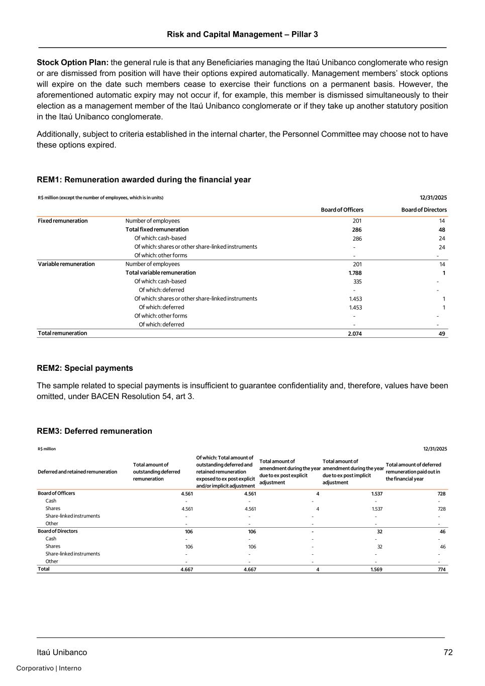 Risk and Capital Management – Pillar 3 __________________________________________________________________________________________ __________________________________________________________________________________________ Itaú Unibanco 72 Corporativo | Interno Stock Option Plan: the general rule is that any Beneficiaries managing the Itaú Unibanco conglomerate who resign or are dismissed from position will have their options expired automatically. Management members’ stock options will expire on the date such members cease to exercise their functions on a permanent basis. However, the aforementioned automatic expiry may not occur if, for example, this member is dismissed simultaneously to their election as a management member of the Itaú Unibanco conglomerate or if they take up another statutory position in the Itaú Unibanco conglomerate. Additionally, subject to criteria established in the internal charter, the Personnel Committee may choose not to have these options expired. REM1: Remuneration awarded during the financial year REM2: Special payments The sample related to special payments is insufficient to guarantee confidentiality and, therefore, values have been omitted, under BACEN Resolution 54, art 3. REM3: Deferred remuneration R$ million (except the number of employees, which is in units) 12/31/2025 Board of Officers Board of Directors Fixed remuneration Number of employees 201 14 Total fixed remuneration 286 48 Of which: cash-based 286 24 Of which: shares or other share-linked instruments - 24 Of which: other forms - - Variable remuneration Number of employees 201 14 Total variable remuneration 1.788 1 Of which: cash-based 335 - Of which: deferred - - Of which: shares or other share-linked instruments 1.453 1 Of which: deferred 1.453 1 Of which: other forms - - Of which: deferred - - Total remuneration 2.074 49 R$ million 12/31/2025 Deferred and retained remuneration Total amount of outstanding deferred remuneration Of which: Total amount of outstanding deferred and retained remuneration exposed to ex post explicit and/or implicit adjustment Total amount of amendment during the year due to ex post explicit adjustment Total amount of amendment during the year due to ex post implicit adjustment Total amount of deferred remuneration paid out in the financial year Board of Officers 4.561 4.561 4 1.537 728 Cash - - - - - Shares 4.561 4.561 4 1.537 728 Share-linked instruments - - - - - Other - - - - - Board of Directors 106 106 - 32 46 Cash - - - - - Shares 106 106 - 32 46 Share-linked instruments - - - - - Other - - - - - Total 4.667 4.667 4 1.569 774