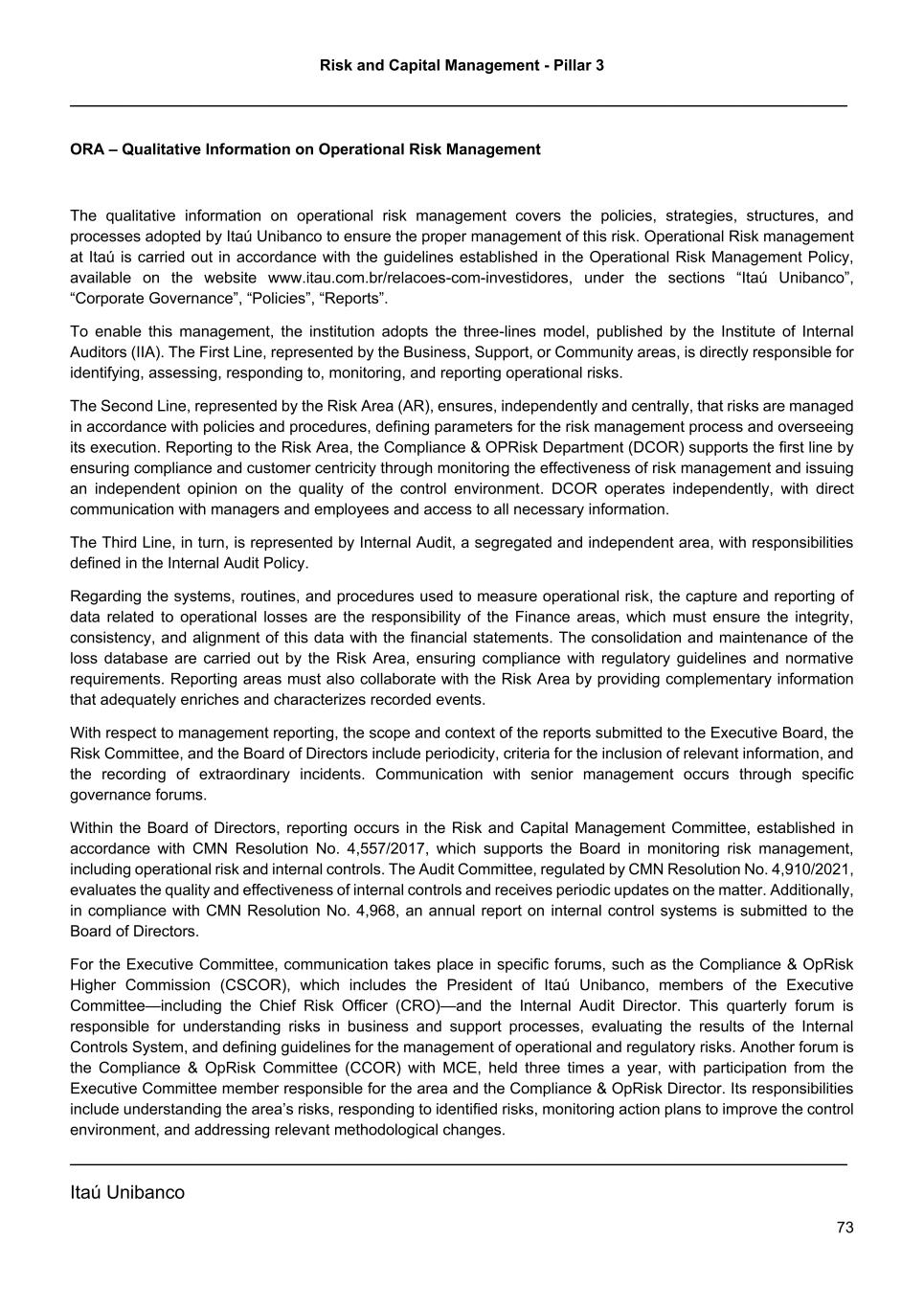 Risk and Capital Management - Pillar 3 __________________________________________________________________________________________ __________________________________________________________________________________________ Itaú Unibanco 73 ORA – Qualitative Information on Operational Risk Management The qualitative information on operational risk management covers the policies, strategies, structures, and processes adopted by Itaú Unibanco to ensure the proper management of this risk. Operational Risk management at Itaú is carried out in accordance with the guidelines established in the Operational Risk Management Policy, available on the website www.itau.com.br/relacoes-com-investidores, under the sections “Itaú Unibanco”, “Corporate Governance”, “Policies”, “Reports”. To enable this management, the institution adopts the three-lines model, published by the Institute of Internal Auditors (IIA). The First Line, represented by the Business, Support, or Community areas, is directly responsible for identifying, assessing, responding to, monitoring, and reporting operational risks. The Second Line, represented by the Risk Area (AR), ensures, independently and centrally, that risks are managed in accordance with policies and procedures, defining parameters for the risk management process and overseeing its execution. Reporting to the Risk Area, the Compliance & OPRisk Department (DCOR) supports the first line by ensuring compliance and customer centricity through monitoring the effectiveness of risk management and issuing an independent opinion on the quality of the control environment. DCOR operates independently, with direct communication with managers and employees and access to all necessary information. The Third Line, in turn, is represented by Internal Audit, a segregated and independent area, with responsibilities defined in the Internal Audit Policy. Regarding the systems, routines, and procedures used to measure operational risk, the capture and reporting of data related to operational losses are the responsibility of the Finance areas, which must ensure the integrity, consistency, and alignment of this data with the financial statements. The consolidation and maintenance of the loss database are carried out by the Risk Area, ensuring compliance with regulatory guidelines and normative requirements. Reporting areas must also collaborate with the Risk Area by providing complementary information that adequately enriches and characterizes recorded events. With respect to management reporting, the scope and context of the reports submitted to the Executive Board, the Risk Committee, and the Board of Directors include periodicity, criteria for the inclusion of relevant information, and the recording of extraordinary incidents. Communication with senior management occurs through specific governance forums. Within the Board of Directors, reporting occurs in the Risk and Capital Management Committee, established in accordance with CMN Resolution No. 4,557/2017, which supports the Board in monitoring risk management, including operational risk and internal controls. The Audit Committee, regulated by CMN Resolution No. 4,910/2021, evaluates the quality and effectiveness of internal controls and receives periodic updates on the matter. Additionally, in compliance with CMN Resolution No. 4,968, an annual report on internal control systems is submitted to the Board of Directors. For the Executive Committee, communication takes place in specific forums, such as the Compliance & OpRisk Higher Commission (CSCOR), which includes the President of Itaú Unibanco, members of the Executive Committee—including the Chief Risk Officer (CRO)—and the Internal Audit Director. This quarterly forum is responsible for understanding risks in business and support processes, evaluating the results of the Internal Controls System, and defining guidelines for the management of operational and regulatory risks. Another forum is the Compliance & OpRisk Committee (CCOR) with MCE, held three times a year, with participation from the Executive Committee member responsible for the area and the Compliance & OpRisk Director. Its responsibilities include understanding the area’s risks, responding to identified risks, monitoring action plans to improve the control environment, and addressing relevant methodological changes.
