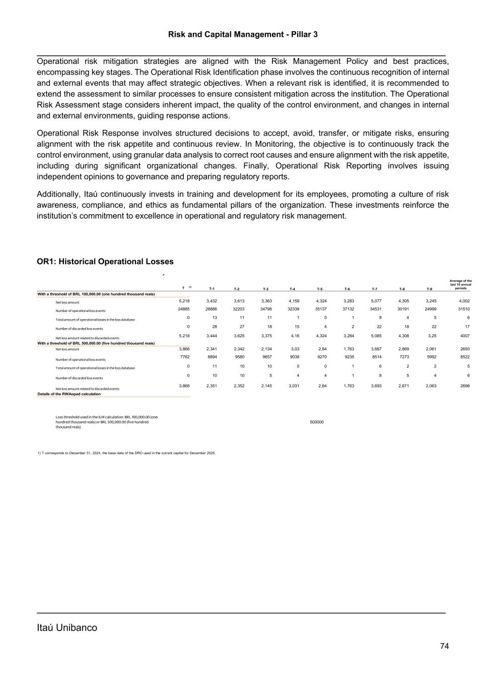Risk and Capital Management - Pillar 3 __________________________________________________________________________________________ __________________________________________________________________________________________ Itaú Unibanco 74 Operational risk mitigation strategies are aligned with the Risk Management Policy and best practices, encompassing key stages. The Operational Risk Identification phase involves the continuous recognition of internal and external events that may affect strategic objectives. When a relevant risk is identified, it is recommended to extend the assessment to similar processes to ensure consistent mitigation across the institution. The Operational Risk Assessment stage considers inherent impact, the quality of the control environment, and changes in internal and external environments, guiding response actions. Operational Risk Response involves structured decisions to accept, avoid, transfer, or mitigate risks, ensuring alignment with the risk appetite and continuous review. In Monitoring, the objective is to continuously track the control environment, using granular data analysis to correct root causes and ensure alignment with the risk appetite, including during significant organizational changes. Finally, Operational Risk Reporting involves issuing independent opinions to governance and preparing regulatory reports. Additionally, Itaú continuously invests in training and development for its employees, promoting a culture of risk awareness, compliance, and ethics as fundamental pillars of the organization. These investments reinforce the institution’s commitment to excellence in operational and regulatory risk management. OR1: Historical Operational Losses (1) T-2 T-3 T-4 T-5 T-6 T-7 T-8 T-9 Average of the last 10 annual periods Net loss amount 5,218 3,432 3,613 3,363 4,159 4,324 3,283 5,077 4,305 3,245 4,002 Number of operational loss events 24885 28886 32203 34798 32339 35137 37132 34531 30191 24999 31510 Total amount of operational losses in the loss database 0 13 11 11 1 0 1 8 4 5 6 Number of discarded loss events 0 28 27 18 15 4 2 22 18 22 17 Net loss amount related to discarded events 5,218 3,444 3,625 3,375 4,16 4,324 3,284 5,085 4,308 3,25 4007 Net loss amount 3,868 2,341 2,342 2,134 3,03 2,84 1,763 3,687 2,869 2,061 2693 Number of operational loss events 7762 8894 9580 9657 9038 9270 9235 8514 7273 5992 8522 Total amount of operational losses in the loss database 0 11 10 10 0 0 1 6 2 2 5 Number of discarded loss events 0 10 10 5 4 4 1 8 5 4 6 Net loss amount related to discarded events 3,868 2,351 2,352 2,145 3,031 2,84 1,763 3,693 2,871 2,063 2698 Loss threshold used in the ILM calculation: BRL 100,000.00 (one hundred thousand reais) or BRL 500,000.00 (five hundred thousand reais) With a threshold of BRL 100,000.00 (one hundred thousand reais) With a threshold of BRL 500,000.00 (five hundred thousand reais) Details of the RWAopad calculation 500000 1) T corresponds to December 31, 2024, the base date of the DRO used in the current capital for December 2025. T-1T