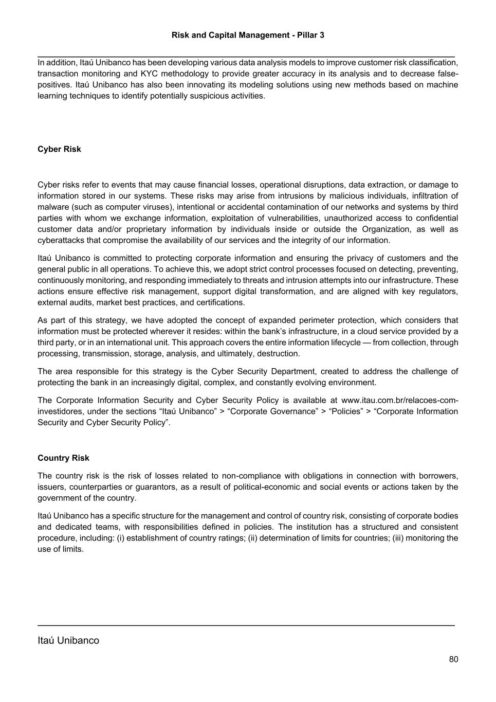 Risk and Capital Management - Pillar 3 __________________________________________________________________________________________ __________________________________________________________________________________________ Itaú Unibanco 80 In addition, Itaú Unibanco has been developing various data analysis models to improve customer risk classification, transaction monitoring and KYC methodology to provide greater accuracy in its analysis and to decrease false- positives. Itaú Unibanco has also been innovating its modeling solutions using new methods based on machine learning techniques to identify potentially suspicious activities. Cyber Risk Cyber risks refer to events that may cause financial losses, operational disruptions, data extraction, or damage to information stored in our systems. These risks may arise from intrusions by malicious individuals, infiltration of malware (such as computer viruses), intentional or accidental contamination of our networks and systems by third parties with whom we exchange information, exploitation of vulnerabilities, unauthorized access to confidential customer data and/or proprietary information by individuals inside or outside the Organization, as well as cyberattacks that compromise the availability of our services and the integrity of our information. Itaú Unibanco is committed to protecting corporate information and ensuring the privacy of customers and the general public in all operations. To achieve this, we adopt strict control processes focused on detecting, preventing, continuously monitoring, and responding immediately to threats and intrusion attempts into our infrastructure. These actions ensure effective risk management, support digital transformation, and are aligned with key regulators, external audits, market best practices, and certifications. As part of this strategy, we have adopted the concept of expanded perimeter protection, which considers that information must be protected wherever it resides: within the bank’s infrastructure, in a cloud service provided by a third party, or in an international unit. This approach covers the entire information lifecycle — from collection, through processing, transmission, storage, analysis, and ultimately, destruction. The area responsible for this strategy is the Cyber Security Department, created to address the challenge of protecting the bank in an increasingly digital, complex, and constantly evolving environment. The Corporate Information Security and Cyber Security Policy is available at www.itau.com.br/relacoes-com- investidores, under the sections “Itaú Unibanco” > “Corporate Governance” > “Policies” > “Corporate Information Security and Cyber Security Policy”. Country Risk The country risk is the risk of losses related to non-compliance with obligations in connection with borrowers, issuers, counterparties or guarantors, as a result of political-economic and social events or actions taken by the government of the country. Itaú Unibanco has a specific structure for the management and control of country risk, consisting of corporate bodies and dedicated teams, with responsibilities defined in policies. The institution has a structured and consistent procedure, including: (i) establishment of country ratings; (ii) determination of limits for countries; (iii) monitoring the use of limits.