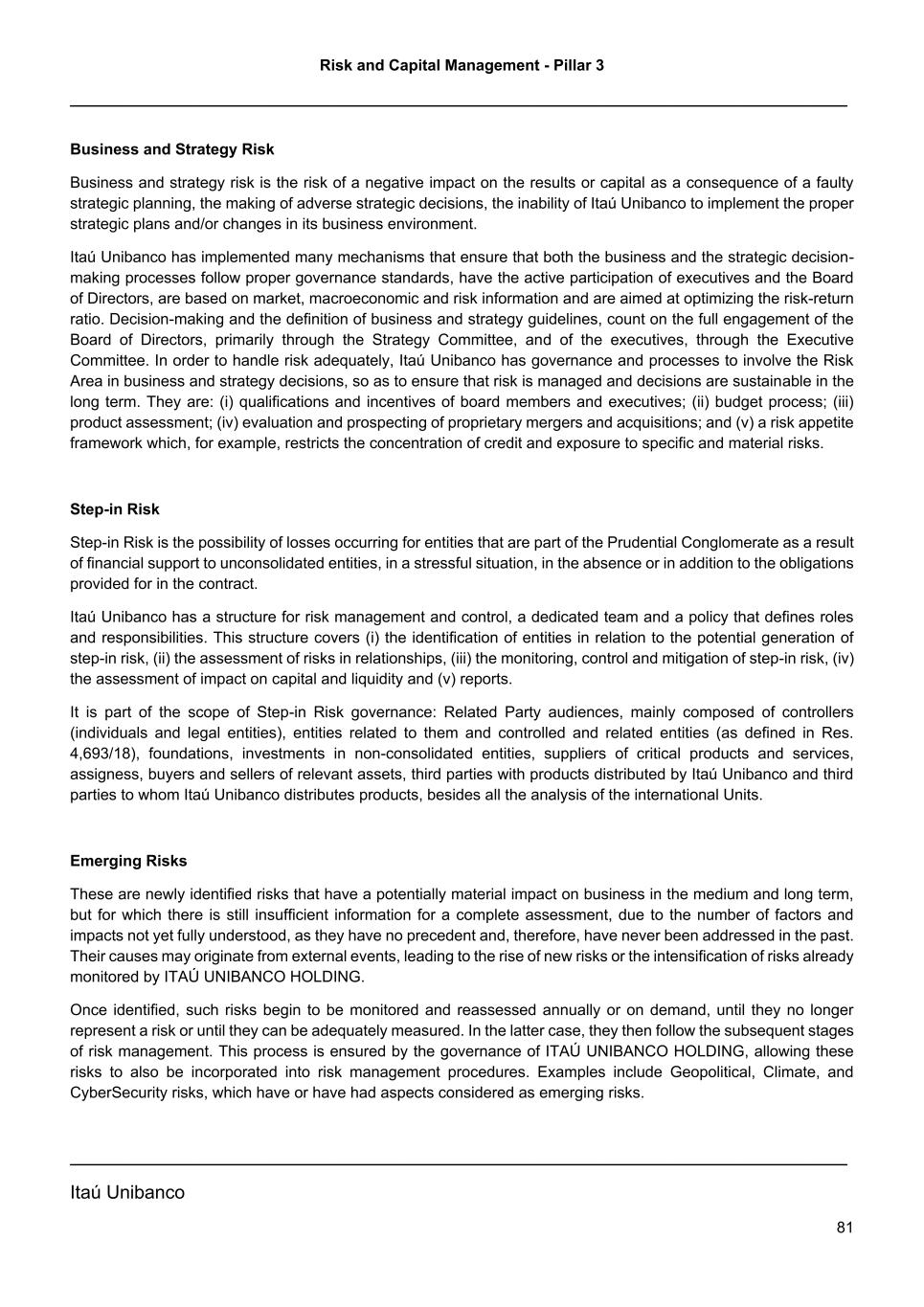Risk and Capital Management - Pillar 3 __________________________________________________________________________________________ __________________________________________________________________________________________ Itaú Unibanco 81 Business and Strategy Risk Business and strategy risk is the risk of a negative impact on the results or capital as a consequence of a faulty strategic planning, the making of adverse strategic decisions, the inability of Itaú Unibanco to implement the proper strategic plans and/or changes in its business environment. Itaú Unibanco has implemented many mechanisms that ensure that both the business and the strategic decision- making processes follow proper governance standards, have the active participation of executives and the Board of Directors, are based on market, macroeconomic and risk information and are aimed at optimizing the risk-return ratio. Decision-making and the definition of business and strategy guidelines, count on the full engagement of the Board of Directors, primarily through the Strategy Committee, and of the executives, through the Executive Committee. In order to handle risk adequately, Itaú Unibanco has governance and processes to involve the Risk Area in business and strategy decisions, so as to ensure that risk is managed and decisions are sustainable in the long term. They are: (i) qualifications and incentives of board members and executives; (ii) budget process; (iii) product assessment; (iv) evaluation and prospecting of proprietary mergers and acquisitions; and (v) a risk appetite framework which, for example, restricts the concentration of credit and exposure to specific and material risks. Step-in Risk Step-in Risk is the possibility of losses occurring for entities that are part of the Prudential Conglomerate as a result of financial support to unconsolidated entities, in a stressful situation, in the absence or in addition to the obligations provided for in the contract. Itaú Unibanco has a structure for risk management and control, a dedicated team and a policy that defines roles and responsibilities. This structure covers (i) the identification of entities in relation to the potential generation of step-in risk, (ii) the assessment of risks in relationships, (iii) the monitoring, control and mitigation of step-in risk, (iv) the assessment of impact on capital and liquidity and (v) reports. It is part of the scope of Step-in Risk governance: Related Party audiences, mainly composed of controllers (individuals and legal entities), entities related to them and controlled and related entities (as defined in Res. 4,693/18), foundations, investments in non-consolidated entities, suppliers of critical products and services, assigness, buyers and sellers of relevant assets, third parties with products distributed by Itaú Unibanco and third parties to whom Itaú Unibanco distributes products, besides all the analysis of the international Units. Emerging Risks These are newly identified risks that have a potentially material impact on business in the medium and long term, but for which there is still insufficient information for a complete assessment, due to the number of factors and impacts not yet fully understood, as they have no precedent and, therefore, have never been addressed in the past. Their causes may originate from external events, leading to the rise of new risks or the intensification of risks already monitored by ITAÚ UNIBANCO HOLDING. Once identified, such risks begin to be monitored and reassessed annually or on demand, until they no longer represent a risk or until they can be adequately measured. In the latter case, they then follow the subsequent stages of risk management. This process is ensured by the governance of ITAÚ UNIBANCO HOLDING, allowing these risks to also be incorporated into risk management procedures. Examples include Geopolitical, Climate, and CyberSecurity risks, which have or have had aspects considered as emerging risks.