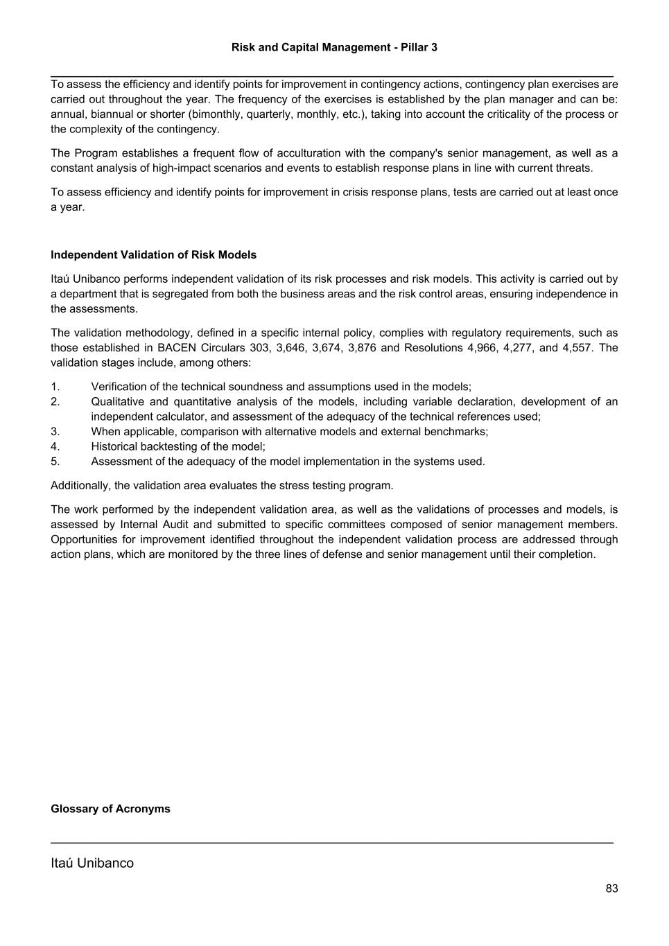 Risk and Capital Management - Pillar 3 __________________________________________________________________________________________ __________________________________________________________________________________________ Itaú Unibanco 83 To assess the efficiency and identify points for improvement in contingency actions, contingency plan exercises are carried out throughout the year. The frequency of the exercises is established by the plan manager and can be: annual, biannual or shorter (bimonthly, quarterly, monthly, etc.), taking into account the criticality of the process or the complexity of the contingency. The Program establishes a frequent flow of acculturation with the company's senior management, as well as a constant analysis of high-impact scenarios and events to establish response plans in line with current threats. To assess efficiency and identify points for improvement in crisis response plans, tests are carried out at least once a year. Independent Validation of Risk Models Itaú Unibanco performs independent validation of its risk processes and risk models. This activity is carried out by a department that is segregated from both the business areas and the risk control areas, ensuring independence in the assessments. The validation methodology, defined in a specific internal policy, complies with regulatory requirements, such as those established in BACEN Circulars 303, 3,646, 3,674, 3,876 and Resolutions 4,966, 4,277, and 4,557. The validation stages include, among others: 1. Verification of the technical soundness and assumptions used in the models; 2. Qualitative and quantitative analysis of the models, including variable declaration, development of an independent calculator, and assessment of the adequacy of the technical references used; 3. When applicable, comparison with alternative models and external benchmarks; 4. Historical backtesting of the model; 5. Assessment of the adequacy of the model implementation in the systems used. Additionally, the validation area evaluates the stress testing program. The work performed by the independent validation area, as well as the validations of processes and models, is assessed by Internal Audit and submitted to specific committees composed of senior management members. Opportunities for improvement identified throughout the independent validation process are addressed through action plans, which are monitored by the three lines of defense and senior management until their completion. Glossary of Acronyms