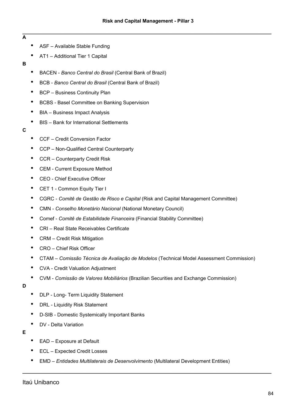 Risk and Capital Management - Pillar 3 __________________________________________________________________________________________ __________________________________________________________________________________________ Itaú Unibanco 84 A • ASF – Available Stable Funding • AT1 – Additional Tier 1 Capital B • BACEN - Banco Central do Brasil (Central Bank of Brazil) • BCB - Banco Central do Brasil (Central Bank of Brazil) • BCP – Business Continuity Plan • BCBS - Basel Committee on Banking Supervision • BIA – Business Impact Analysis • BIS – Bank for International Settlements C • CCF – Credit Conversion Factor • CCP – Non-Qualified Central Counterparty • CCR – Counterparty Credit Risk • CEM - Current Exposure Method • CEO - Chief Executive Officer • CET 1 - Common Equity Tier I • CGRC - Comitê de Gestão de Risco e Capital (Risk and Capital Management Committee) • CMN - Conselho Monetário Nacional (National Monetary Council) • Comef - Comitê de Estabilidade Financeira (Financial Stability Committee) • CRI – Real State Receivables Certificate • CRM – Credit Risk Mitigation • CRO – Chief Risk Officer • CTAM – Comissão Técnica de Avaliação de Modelos (Technical Model Assessment Commission) • CVA - Credit Valuation Adjustment • CVM - Comissão de Valores Mobiliários (Brazilian Securities and Exchange Commission) D • DLP - Long- Term Liquidity Statement • DRL - Liquidity Risk Statement • D-SIB - Domestic Systemically Important Banks • DV - Delta Variation E • EAD – Exposure at Default • ECL – Expected Credit Losses • EMD – Entidades Multilaterais de Desenvolvimento (Multilateral Development Entities)