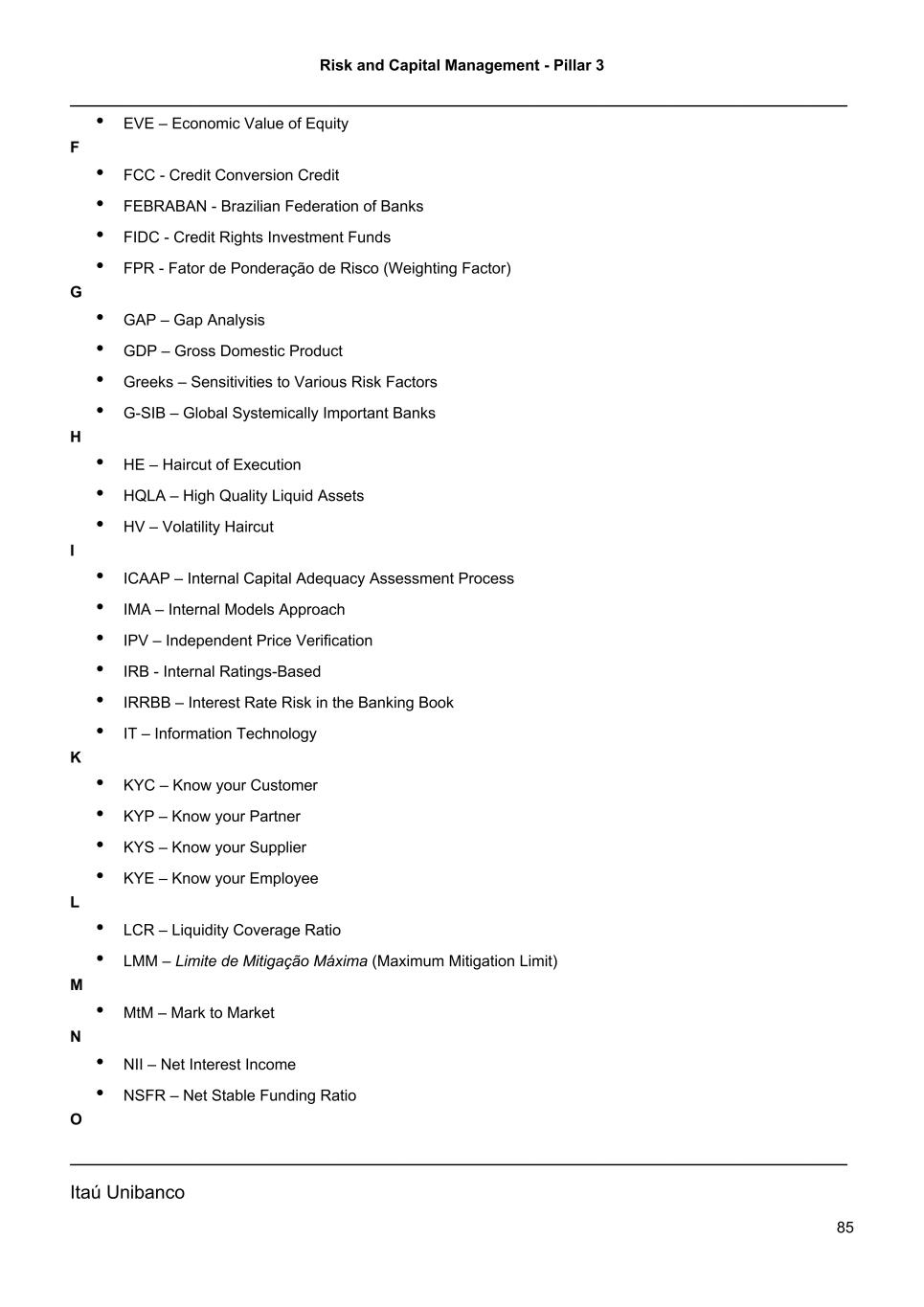 Risk and Capital Management - Pillar 3 __________________________________________________________________________________________ __________________________________________________________________________________________ Itaú Unibanco 85 • EVE – Economic Value of Equity F • FCC - Credit Conversion Credit • FEBRABAN - Brazilian Federation of Banks • FIDC - Credit Rights Investment Funds • FPR - Fator de Ponderação de Risco (Weighting Factor) G • GAP – Gap Analysis • GDP – Gross Domestic Product • Greeks – Sensitivities to Various Risk Factors • G-SIB – Global Systemically Important Banks H • HE – Haircut of Execution • HQLA – High Quality Liquid Assets • HV – Volatility Haircut I • ICAAP – Internal Capital Adequacy Assessment Process • IMA – Internal Models Approach • IPV – Independent Price Verification • IRB - Internal Ratings-Based • IRRBB – Interest Rate Risk in the Banking Book • IT – Information Technology K • KYC – Know your Customer • KYP – Know your Partner • KYS – Know your Supplier • KYE – Know your Employee L • LCR – Liquidity Coverage Ratio • LMM – Limite de Mitigação Máxima (Maximum Mitigation Limit) M • MtM – Mark to Market N • NII – Net Interest Income • NSFR – Net Stable Funding Ratio O