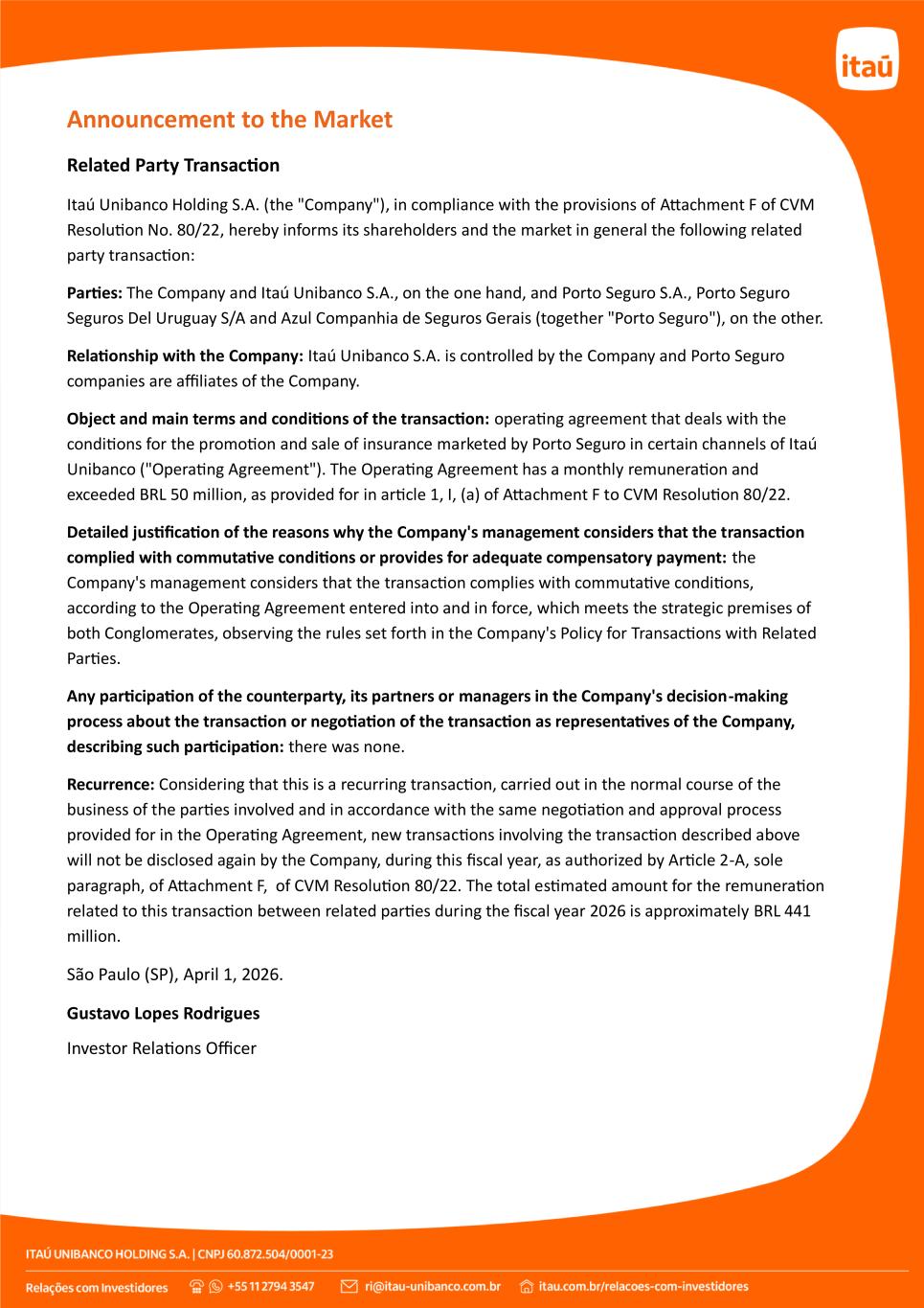 Announcement to the Market Related Party Transaction Itaú Unibanco Holding S.A. (the "Company"), in compliance with the provisions of Attachment F of CVM Resolution No. 80/22, hereby informs its shareholders and the market in general the following related party transaction: Parties: The Company and Itaú Unibanco S.A., on the one hand, and Porto Seguro S.A., Porto Seguro Seguros Del Uruguay S/A and Azul Companhia de Seguros Gerais (together "Porto Seguro"), on the other. Relationship with the Company: Itaú Unibanco S.A. is controlled by the Company and Porto Seguro companies are affiliates of the Company. Object and main terms and conditions of the transaction: operating agreement that deals with the conditions for the promotion and sale of insurance marketed by Porto Seguro in certain channels of Itaú Unibanco ("Operating Agreement"). The Operating Agreement has a monthly remuneration and exceeded BRL 50 million, as provided for in article 1, I, (a) of Attachment F to CVM Resolution 80/22. Detailed justification of the reasons why the Company's management considers that the transaction complied with commutative conditions or provides for adequate compensatory payment: the Company's management considers that the transaction complies with commutative conditions, according to the Operating Agreement entered into and in force, which meets the strategic premises of both Conglomerates, observing the rules set forth in the Company's Policy for Transactions with Related Parties. Any participation of the counterparty, its partners or managers in the Company's decision-making process about the transaction or negotiation of the transaction as representatives of the Company, describing such participation: there was none. Recurrence: Considering that this is a recurring transaction, carried out in the normal course of the business of the parties involved and in accordance with the same negotiation and approval process provided for in the Operating Agreement, new transactions involving the transaction described above will not be disclosed again by the Company, during this fiscal year, as authorized by Article 2-A, sole paragraph, of Attachment F, of CVM Resolution 80/22. The total estimated amount for the remuneration related to this transaction between related parties during the fiscal year 2026 is approximately BRL 441 million. São Paulo (SP), April 1, 2026. Gustavo Lopes Rodrigues Investor Relations Officer
