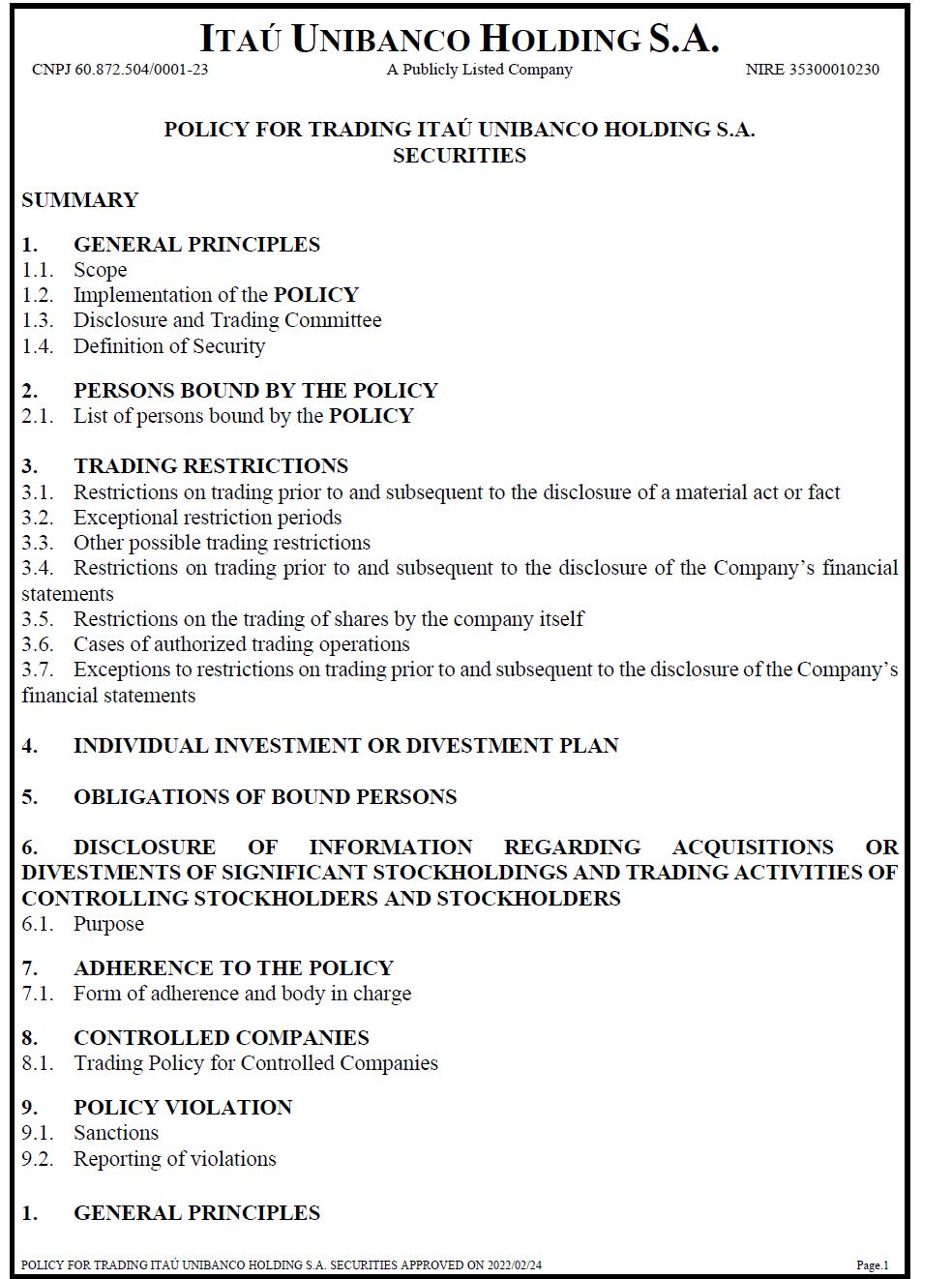 ITAÚ UNIBANCO HOLDING S.A. CNPJ 60.872.504/0001-23 A Publicly Listed Company NIRE 35300010230 POLICY FOR TRADING ITAÚ UNIBANCO HOLDING S.A. SECURITIES SUMMARY 1. GENERAL PRINCIPLES 1.1. Scope 1.2. Implementation of the POLICY 1.3. Disclosure and Trading Committee 1.4. Definition of Security 2. PERSONS BOUND BY THE POLICY 2.1. List of persons bound by the POLICY 3. TRADING RESTRICTIONS 3.1. Restrictions on trading prior to and subsequent to the disclosure of a material act or fact 3.2. Exceptional restriction periods 3.3. Other possible trading restrictions 3.4. Restrictions on trading prior to and subsequent to the disclosure of the Company’s financial statements 3.5. Restrictions on the trading of shares by the company itself 3.6. Cases of authorized trading operations 3.7. Exceptions to restrictions on trading prior to and subsequent to the disclosure of the Company’s financial statements 4. INDIVIDUAL INVESTMENT OR DIVESTMENT PLAN 5. OBLIGATIONS OF BOUND PERSONS 6. DISCLOSURE OF INFORMATION REGARDING ACQUISITIONS OR DIVESTMENTS OF SIGNIFICANT STOCKHOLDINGS AND TRADING ACTIVITIES OF CONTROLLING STOCKHOLDERS AND STOCKHOLDERS 6.1. Purpose 7. ADHERENCE TO THE POLICY 7.1. Form of adherence and body in charge 8. CONTROLLED COMPANIES 8.1. Trading Policy for Controlled Companies 9. POLICY VIOLATION 9.1. Sanctions 9.2. Reporting of violations 1. GENERAL PRINCIPLES