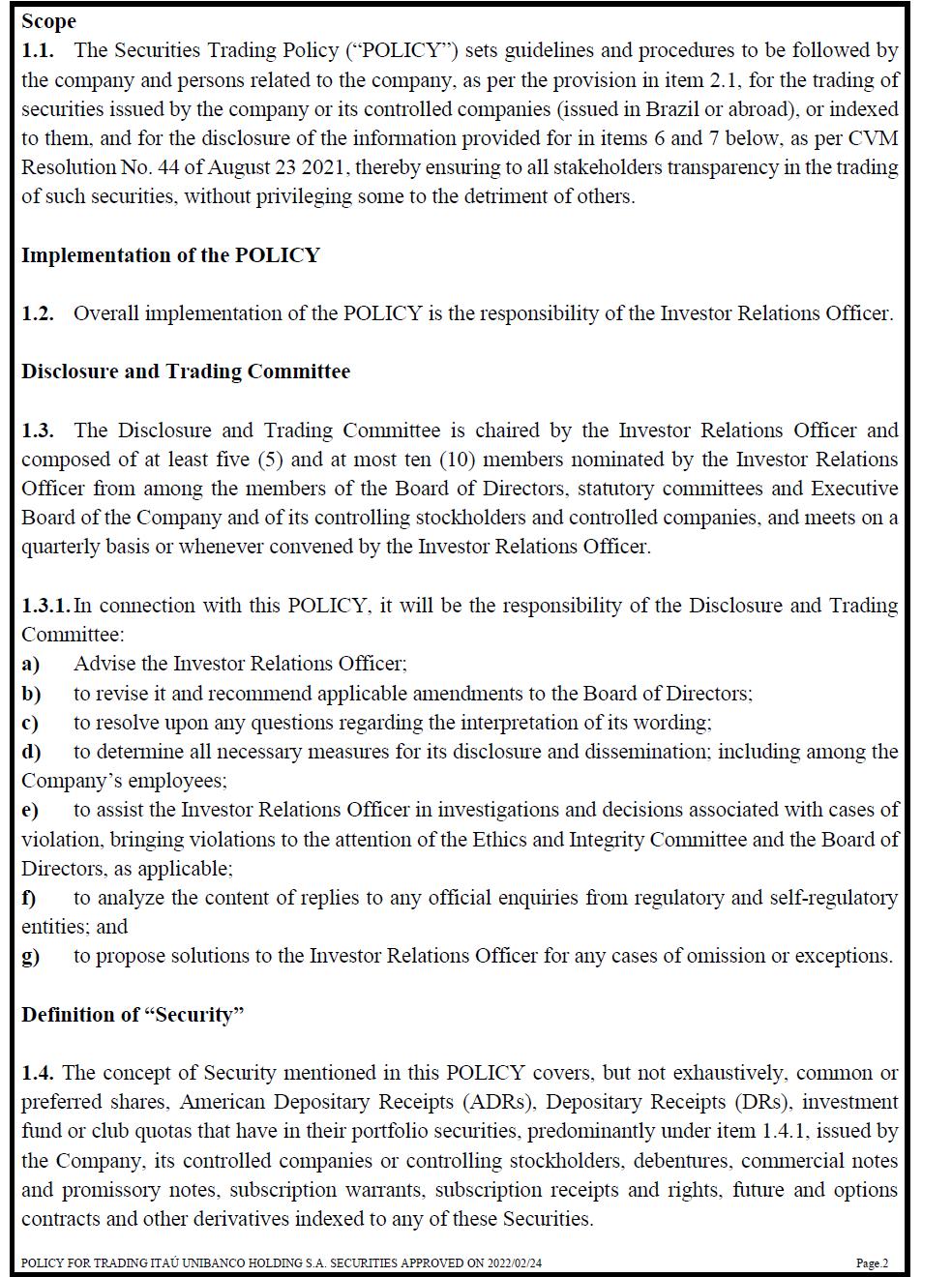 Scope 1.1. The Securities Trading Policy (“POLICY”) sets guidelines and procedures to be followed by the company and persons related to the company, as per the provision in item 2.1, for the trading of securities issued by the company or its controlled companies (issued in Brazil or abroad), or indexed to them, and for the disclosure of the information provided for in items 6 and 7 below, as per CVM Resolution No. 44 of August 23 2021, thereby ensuring to all stakeholders transparency in the trading of such securities, without privileging some to the detriment of others. Implementation of the POLICY 1.2. Overall implementation of the POLICY is the responsibility of the Investor Relations Officer. Disclosure and Trading Committee 1.3. The Disclosure and Trading Committee is chaired by the Investor Relations Officer and composed of at least five (5) and at most ten (10) members nominated by the Investor Relations Officer from among the members of the Board of Directors, statutory committees and Executive Board of the Company and of its controlling stockholders and controlled companies, and meets on a quarterly basis or whenever convened by the Investor Relations Officer. 1.3.1. In connection with this POLICY, it will be the responsibility of the Disclosure and Trading Committee: a) Advise the Investor Relations Officer; b) to revise it and recommend applicable amendments to the Board of Directors; c) to resolve upon any questions regarding the interpretation of its wording; d) to determine all necessary measures for its disclosure and dissemination; including among the Company’s employees; e) to assist the Investor Relations Officer in investigations and decisions associated with cases of violation, bringing violations to the attention of the Ethics and Integrity Committee and the Board of Directors, as applicable; f) to analyze the content of replies to any official enquiries from regulatory and self-regulatory entities; and g) to propose solutions to the Investor Relations Officer for any cases of omission or exceptions. Definition of “Security” 1.4. The concept of Security mentioned in this POLICY covers, but not exhaustively, common or preferred shares, American Depositary Receipts (ADRs), Depositary Receipts (DRs), investment fund or club quotas that have in their portfolio securities, predominantly under item 1.4.1, issued by the Company, its controlled companies or controlling stockholders, debentures, commercial notes and promissory notes, subscription warrants, subscription receipts and rights, future and options contracts and other derivatives indexed to any of these Securities.