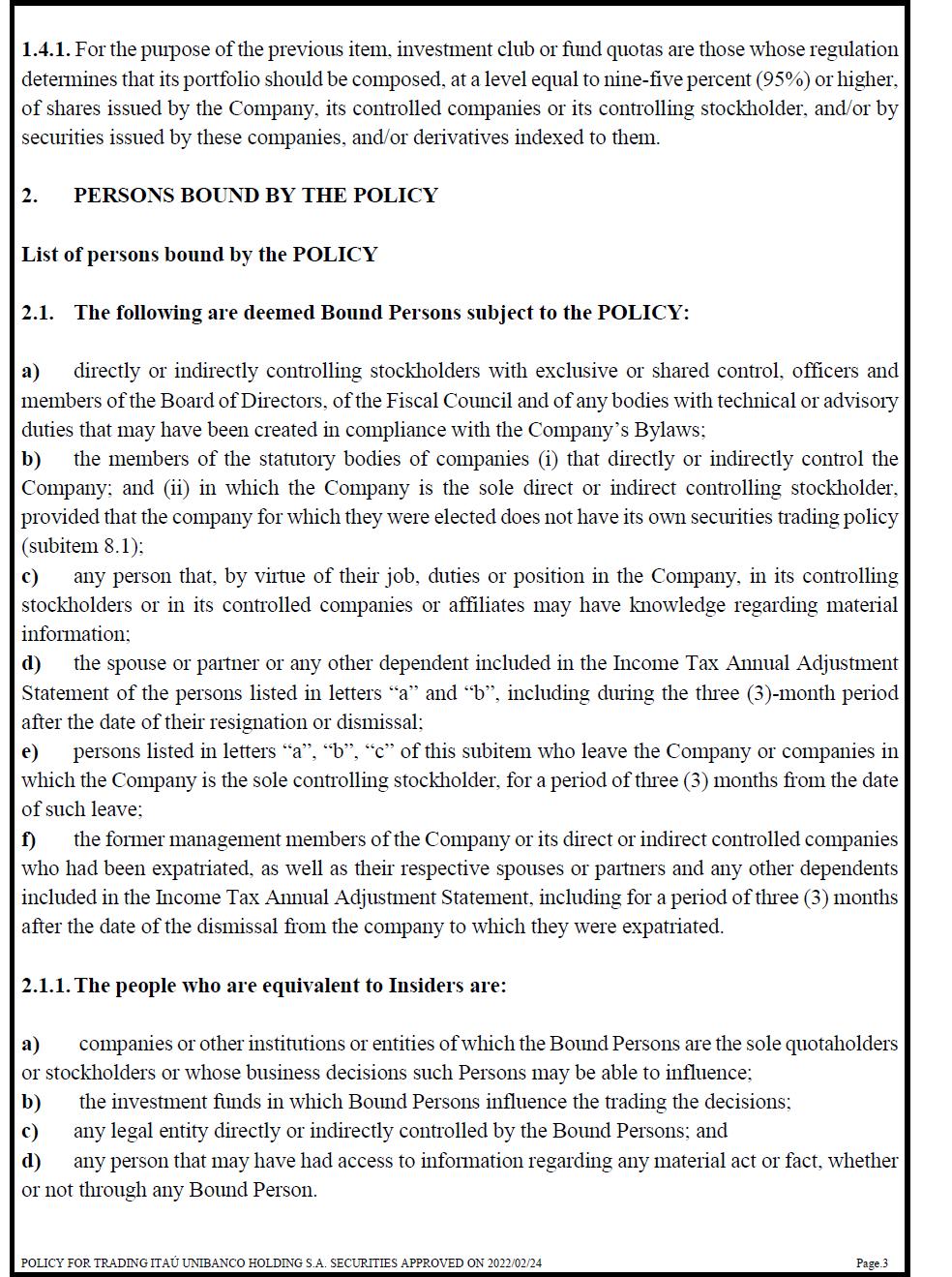 1.4.1. For the purpose of the previous item, investment club or fund quotas are those whose regulation determines that its portfolio should be composed, at a level equal to nine-five percent (95%) or higher, of shares issued by the Company, its controlled companies or its controlling stockholder, and/or by securities issued by these companies, and/or derivatives indexed to them. 2. PERSONS BOUND BY THE POLICY List of persons bound by the POLICY 2.1. The following are deemed Bound Persons subject to the POLICY: a) directly or indirectly controlling stockholders with exclusive or shared control, officers and members of the Board of Directors, of the Fiscal Council and of any bodies with technical or advisory duties that may have been created in compliance with the Company’s Bylaws; b) the members of the statutory bodies of companies (i) that directly or indirectly control the Company; and (ii) in which the Company is the sole direct or indirect controlling stockholder, provided that the company for which they were elected does not have its own securities trading policy (subitem 8.1); c) any person that, by virtue of their job, duties or position in the Company, in its controlling stockholders or in its controlled companies or affiliates may have knowledge regarding material information; d) the spouse or partner or any other dependent included in the Income Tax Annual Adjustment Statement of the persons listed in letters “a” and “b”, including during the three (3)-month period after the date of their resignation or dismissal; e) persons listed in letters “a”, “b”, “c” of this subitem who leave the Company or companies in which the Company is the sole controlling stockholder, for a period of three (3) months from the date of such leave; f) the former management members of the Company or its direct or indirect controlled companies who had been expatriated, as well as their respective spouses or partners and any other dependents included in the Income Tax Annual Adjustment Statement, including for a period of three (3) months after the date of the dismissal from the company to which they were expatriated. 2.1.1. The people who are equivalent to Insiders are: a) companies or other institutions or entities of which the Bound Persons are the sole quotaholders or stockholders or whose business decisions such Persons may be able to influence; b) the investment funds in which Bound Persons influence the trading the decisions; c) any legal entity directly or indirectly controlled by the Bound Persons; and d) any person that may have had access to information regarding any material act or fact, whether or not through any Bound Person.