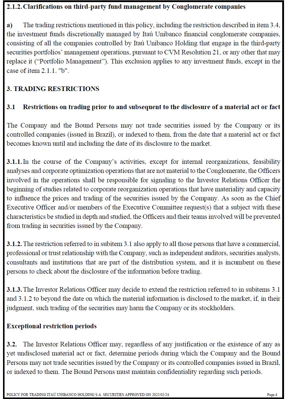 2.1.2. Clarifications on third-party fund management by Conglomerate companies a) The trading restrictions mentioned in this policy, including the restriction described in item 3.4, the investment funds discretionally managed by Itaú Unibanco financial conglomerate companies, consisting of all the companies controlled by Itaú Unibanco Holding that engage in the third-party securities portfolios’ management operations, pursuant to CVM Resolution 21, or any other that may replace it (“Portfolio Management”). This exclusion applies to any investment funds, except in the case of item 2.1.1. "b". 3. TRADING RESTRICTIONS 3.1 Restrictions on trading prior to and subsequent to the disclosure of a material act or fact The Company and the Bound Persons may not trade securities issued by the Company or its controlled companies (issued in Brazil), or indexed to them, from the date that a material act or fact becomes known until and including the date of its disclosure to the market. 3.1.1. In the course of the Company’s activities, except for internal reorganizations, feasibility analyses and corporate optimization operations that are not material to the Conglomerate, the Officers involved in the operations shall be responsible for signaling to the Investor Relations Officer the beginning of studies related to corporate reorganization operations that have materiality and capacity to influence the prices and trading of the securities issued by the Company. As soon as the Chief Executive Officer and/or members of the Executive Committee request(s) that a subject with these characteristics be studied in depth and studied, the Officers and their teams involved will be prevented from trading in securities issued by the Company. 3.1.2. The restriction referred to in subitem 3.1 also apply to all those persons that have a commercial, professional or trust relationship with the Company, such as independent auditors, securities analysts, consultants and institutions that are part of the distribution system, and it is incumbent on these persons to check about the disclosure of the information before trading. 3.1.3. The Investor Relations Officer may decide to extend the restriction referred to in subitems 3.1 and 3.1.2 to beyond the date on which the material information is disclosed to the market, if, in their judgment, such trading of the securities may harm the Company or its stockholders. Exceptional restriction periods 3.2. The Investor Relations Officer may, regardless of any justification or the existence of any as yet undisclosed material act or fact, determine periods during which the Company and the Bound Persons may not trade securities issued by the Company or its controlled companies issued in Brazil, or indexed to them. The Bound Persons must maintain confidentiality regarding such periods.