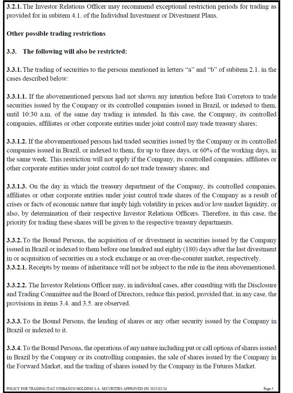 3.2.1. The Investor Relations Officer may recommend exceptional restriction periods for trading as provided for in subitem 4.1. of the Individual Investment or Divestment Plans. Other possible trading restrictions 3.3. The following will also be restricted: 3.3.1. The trading of securities to the persons mentioned in letters “a” and “b” of subitem 2.1. in the cases described below: 3.3.1.1. If the abovementioned persons had not shown any intention before Itaú Corretora to trade securities issued by the Company or its controlled companies issued in Brazil, or indexed to them, until 10:30 a.m. of the same day trading is intended. In this case, the Company, its controlled companies, affiliates or other corporate entities under joint control may trade treasury shares; 3.3.1.2. If the abovementioned persons had traded securities issued by the Company or its controlled companies issued in Brazil, or indexed to them, for up to three days, or 60% of the working days, in the same week. This restriction will not apply if the Company, its controlled companies, affiliates or other corporate entities under joint control do not trade treasury shares; and 3.3.1.3. On the day in which the treasury department of the Company, its controlled companies, affiliates or other corporate entities under joint control trade shares of the Company as a result of crises or facts of economic nature that imply high volatility in prices and/or low market liquidity, or also, by determination of their respective Investor Relations Officers. Therefore, in this case, the priority for trading these shares will be given to the respective treasury departments. 3.3.2. To the Bound Persons, the acquisition of or divestment in securities issued by the Company issued in Brazil or indexed to them before one hundred and eighty (180) days after the last divestment in or acquisition of securities on a stock exchange or an over-the-counter market, respectively. 3.3.2.1. Receipts by means of inheritance will not be subject to the rule in the item abovementioned. 3.3.2.2. The Investor Relations Officer may, in individual cases, after consulting with the Disclosure and Trading Committee and the Board of Directors, reduce this period, provided that, in any case, the provisions in items 3.4. and 3.5. are observed. 3.3.3. To the Bound Persons, the lending of shares or any other security issued by the Company in Brazil or indexed to it. 3.3.4. To the Bound Persons, the operations of any nature including put or call options of shares issued in Brazil by the Company or its controlling companies, the sale of shares issued by the Company in the Forward Market, and the trading of shares issued by the Company in the Futures Market.