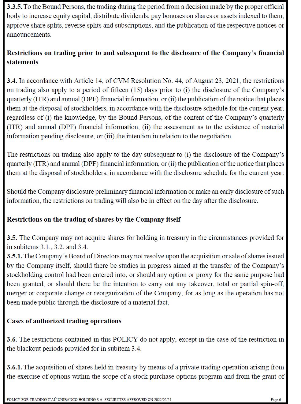 3.3.5. To the Bound Persons, the trading during the period from a decision made by the proper official body to increase equity capital, distribute dividends, pay bonuses on shares or assets indexed to them, approve share splits, reverse splits and subscriptions, and the publication of the respective notices or announcements. Restrictions on trading prior to and subsequent to the disclosure of the Company’s financial statements 3.4. In accordance with Article 14, of CVM Resolution No. 44, of August 23, 2021, the restrictions on trading also apply to a period of fifteen (15) days prior to (i) the disclosure of the Company’s quarterly (ITR) and annual (DPF) financial information, or (ii) the publication of the notice that places them at the disposal of stockholders, in accordance with the disclosure schedule for the current year, regardless of (i) the knowledge, by the Bound Persons, of the content of the Company’s quarterly (ITR) and annual (DPF) financial information, (ii) the assessment as to the existence of material information pending disclosure, or (iii) the intention in relation to the negotiation. The restrictions on trading also apply to the day subsequent to (i) the disclosure of the Company’s quarterly (ITR) and annual (DPF) financial information, or (ii) the publication of the notice that places them at the disposal of stockholders, in accordance with the disclosure schedule for the current year. Should the Company disclosure preliminary financial information or make an early disclosure of such information, the restrictions on trading will also be in effect on the day after the disclosure. Restrictions on the trading of shares by the Company itself 3.5. The Company may not acquire shares for holding in treasury in the circumstances provided for in subitems 3.1., 3.2. and 3.4. 3.5.1. The Company’s Board of Directors may not resolve upon the acquisition or sale of shares issued by the Company itself, should there be studies in progress aimed at the transfer of the Company’s stockholding control had been entered into, or should any option or proxy for the same purpose had been granted, or should there be the intention to carry out any takeover, total or partial spin-off, merger or corporate change or reorganization of the Company, for as long as the operation has not been made public through the disclosure of a material fact. Cases of authorized trading operations 3.6. The restrictions contained in this POLICY do not apply, except in the case of the restriction in the blackout periods provided for in subitem 3.4. 3.6.1. The acquisition of shares held in treasury by means of a private trading operation arising from the exercise of options within the scope of a stock purchase options program and from the grant of