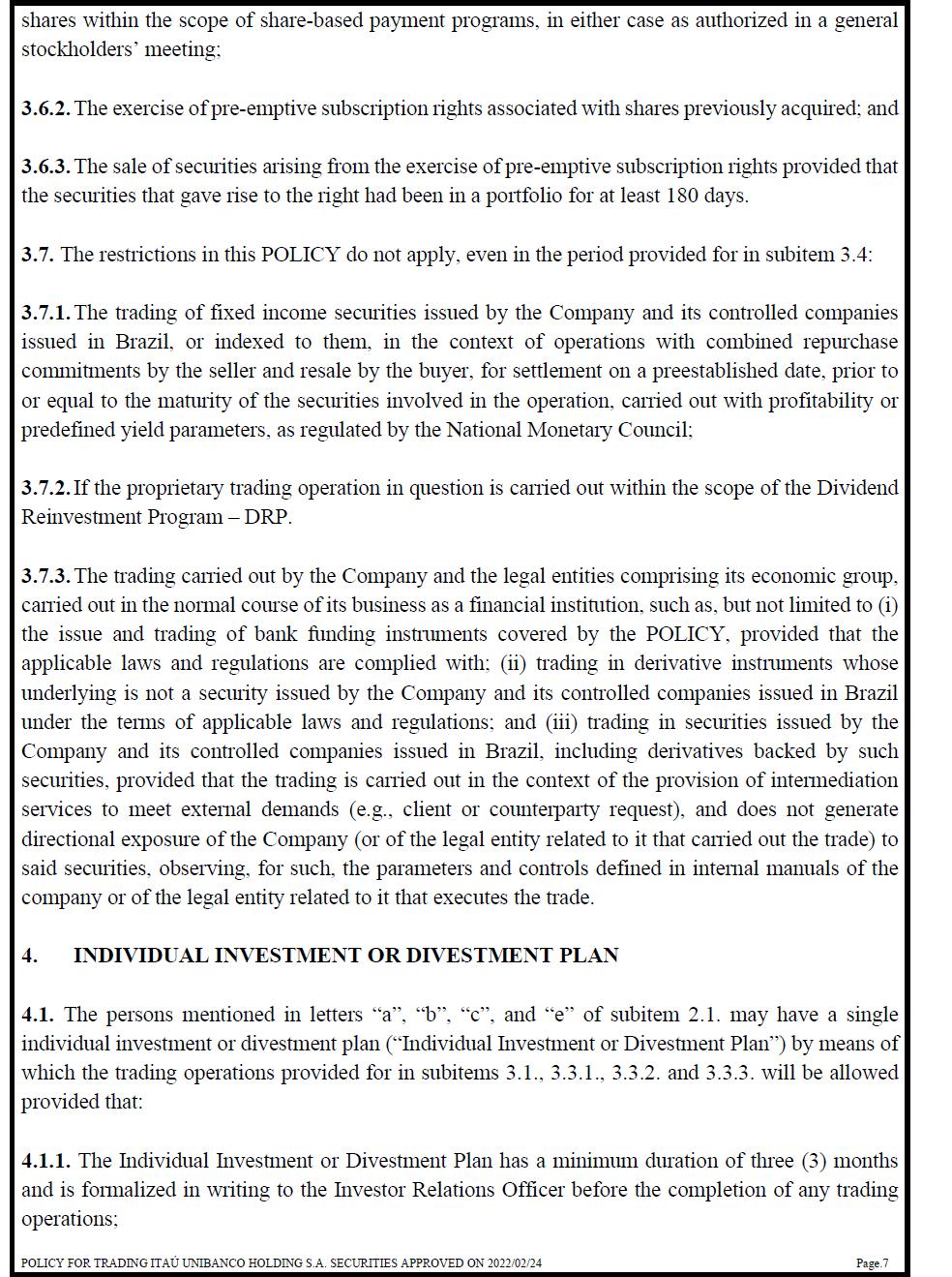 shares within the scope of share-based payment programs, in either case as authorized in a general stockholders’ meeting; 3.6.2. The exercise of pre-emptive subscription rights associated with shares previously acquired; and 3.6.3. The sale of securities arising from the exercise of pre-emptive subscription rights provided that the securities that gave rise to the right had been in a portfolio for at least 180 days. 3.7. The restrictions in this POLICY do not apply, even in the period provided for in subitem 3.4: 3.7.1. The trading of fixed income securities issued by the Company and its controlled companies issued in Brazil, or indexed to them, in the context of operations with combined repurchase commitments by the seller and resale by the buyer, for settlement on a preestablished date, prior to or equal to the maturity of the securities involved in the operation, carried out with profitability or predefined yield parameters, as regulated by the National Monetary Council; 3.7.2. If the proprietary trading operation in question is carried out within the scope of the Dividend Reinvestment Program – DRP. 3.7.3. The trading carried out by the Company and the legal entities comprising its economic group, carried out in the normal course of its business as a financial institution, such as, but not limited to (i) the issue and trading of bank funding instruments covered by the POLICY, provided that the applicable laws and regulations are complied with; (ii) trading in derivative instruments whose underlying is not a security issued by the Company and its controlled companies issued in Brazil under the terms of applicable laws and regulations; and (iii) trading in securities issued by the Company and its controlled companies issued in Brazil, including derivatives backed by such securities, provided that the trading is carried out in the context of the provision of intermediation services to meet external demands (e.g., client or counterparty request), and does not generate directional exposure of the Company (or of the legal entity related to it that carried out the trade) to said securities, observing, for such, the parameters and controls defined in internal manuals of the company or of the legal entity related to it that executes the trade. 4. INDIVIDUAL INVESTMENT OR DIVESTMENT PLAN 4.1. The persons mentioned in letters “a”, “b”, “c”, and “e” of subitem 2.1. may have a single individual investment or divestment plan (“Individual Investment or Divestment Plan”) by means of which the trading operations provided for in subitems 3.1., 3.3.1., 3.3.2. and 3.3.3. will be allowed provided that: 4.1.1. The Individual Investment or Divestment Plan has a minimum duration of three (3) months and is formalized in writing to the Investor Relations Officer before the completion of any trading operations;