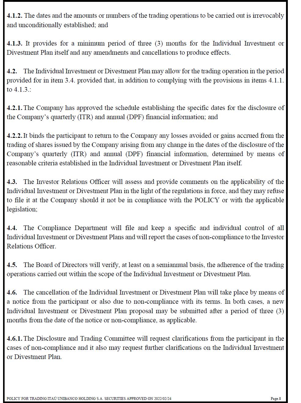 4.1.2. The dates and the amounts or numbers of the trading operations to be carried out is irrevocably and unconditionally established; and 4.1.3. It provides for a minimum period of three (3) months for the Individual Investment or Divestment Plan itself and any amendments and cancellations to produce effects. 4.2. The Individual Investment or Divestment Plan may allow for the trading operation in the period provided for in item 3.4. provided that, in addition to complying with the provisions in items 4.1.1. to 4.1.3.: 4.2.1. The Company has approved the schedule establishing the specific dates for the disclosure of the Company’s quarterly (ITR) and annual (DPF) financial information; and 4.2.2. It binds the participant to return to the Company any losses avoided or gains accrued from the trading of shares issued by the Company arising from any change in the dates of the disclosure of the Company’s quarterly (ITR) and annual (DPF) financial information, determined by means of reasonable criteria established in the Individual Investment or Divestment Plan itself. 4.3. The Investor Relations Officer will assess and provide comments on the applicability of the Individual Investment or Divestment Plan in the light of the regulations in force, and they may refuse to file it at the Company should it not be in compliance with the POLICY or with the applicable legislation; 4.4. The Compliance Department will file and keep a specific and individual control of all Individual Investment or Divestment Plans and will report the cases of non-compliance to the Investor Relations Officer. 4.5. The Board of Directors will verify, at least on a semiannual basis, the adherence of the trading operations carried out within the scope of the Individual Investment or Divestment Plan. 4.6. The cancellation of the Individual Investment or Divestment Plan will take place by means of a notice from the participant or also due to non-compliance with its terms. In both cases, a new Individual Investment or Divestment Plan proposal may be submitted after a period of three (3) months from the date of the notice or non-compliance, as applicable. 4.6.1. The Disclosure and Trading Committee will request clarifications from the participant in the cases of non-compliance and it also may request further clarifications on the Individual Investment or Divestment Plan.