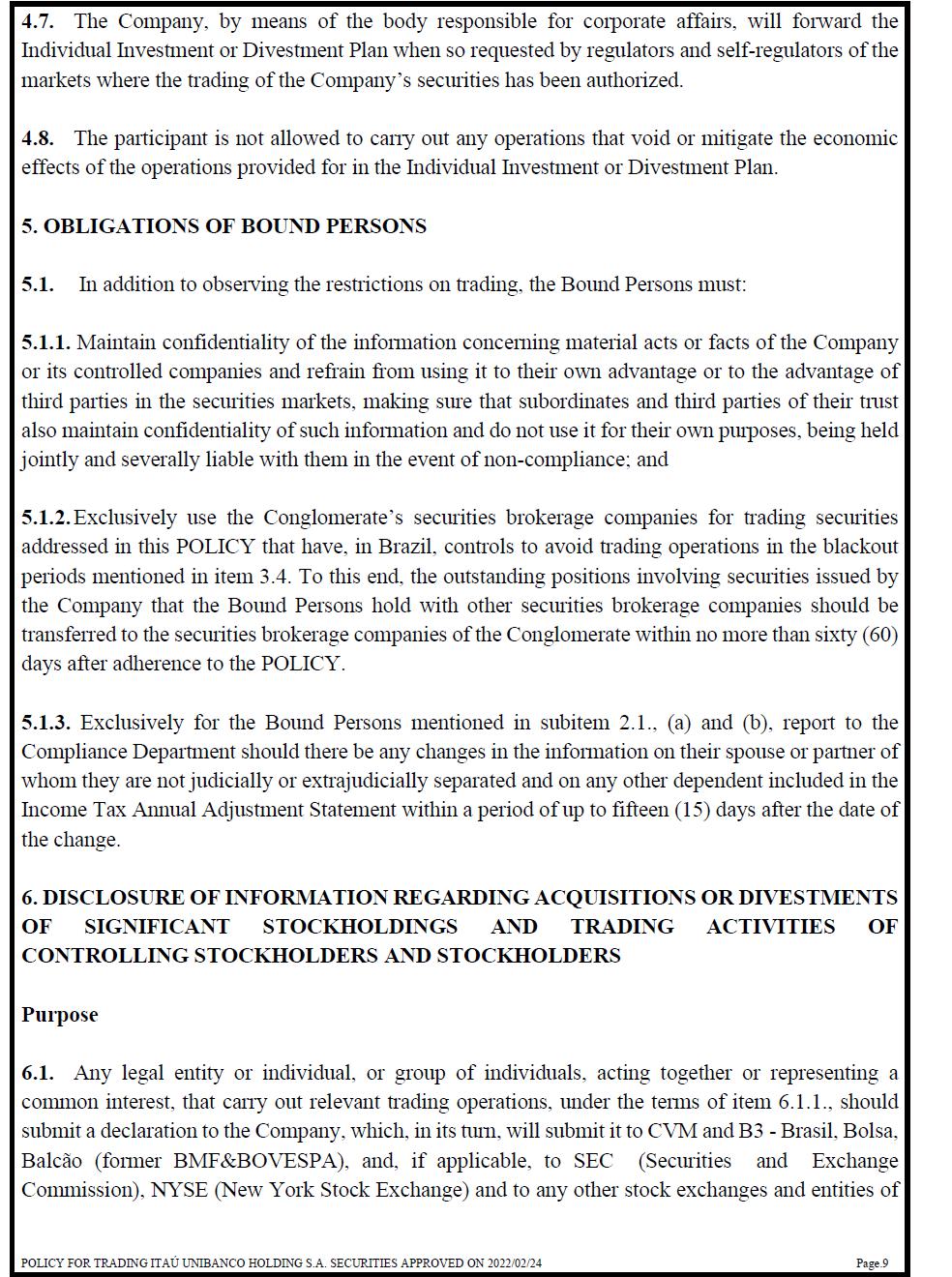 4.7. The Company, by means of the body responsible for corporate affairs, will forward the Individual Investment or Divestment Plan when so requested by regulators and self-regulators of the markets where the trading of the Company’s securities has been authorized. 4.8. The participant is not allowed to carry out any operations that void or mitigate the economic effects of the operations provided for in the Individual Investment or Divestment Plan. 5. OBLIGATIONS OF BOUND PERSONS 5.1. In addition to observing the restrictions on trading, the Bound Persons must: 5.1.1. Maintain confidentiality of the information concerning material acts or facts of the Company or its controlled companies and refrain from using it to their own advantage or to the advantage of third parties in the securities markets, making sure that subordinates and third parties of their trust also maintain confidentiality of such information and do not use it for their own purposes, being held jointly and severally liable with them in the event of non-compliance; and 5.1.2. Exclusively use the Conglomerate’s securities brokerage companies for trading securities addressed in this POLICY that have, in Brazil, controls to avoid trading operations in the blackout periods mentioned in item 3.4. To this end, the outstanding positions involving securities issued by the Company that the Bound Persons hold with other securities brokerage companies should be transferred to the securities brokerage companies of the Conglomerate within no more than sixty (60) days after adherence to the POLICY. 5.1.3. Exclusively for the Bound Persons mentioned in subitem 2.1., (a) and (b), report to the Compliance Department should there be any changes in the information on their spouse or partner of whom they are not judicially or extrajudicially separated and on any other dependent included in the Income Tax Annual Adjustment Statement within a period of up to fifteen (15) days after the date of the change. 6. DISCLOSURE OF INFORMATION REGARDING ACQUISITIONS OR DIVESTMENTS OF SIGNIFICANT STOCKHOLDINGS AND TRADING ACTIVITIES OF CONTROLLING STOCKHOLDERS AND STOCKHOLDERS Purpose 6.1. Any legal entity or individual, or group of individuals, acting together or representing a common interest, that carry out relevant trading operations, under the terms of item 6.1.1., should submit a declaration to the Company, which, in its turn, will submit it to CVM and B3 - Brasil, Bolsa, Balcão (former BMF&BOVESPA), and, if applicable, to SEC (Securities and Exchange Commission), NYSE (New York Stock Exchange) and to any other stock exchanges and entities of