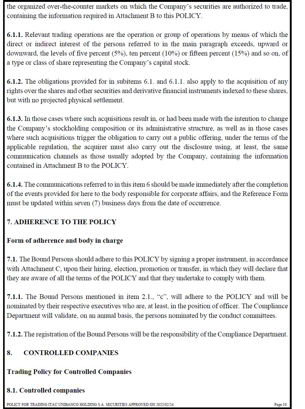 the organized over-the-counter markets on which the Company’s securities are authorized to trade, containing the information required in Attachment B to this POLICY. 6.1.1. Relevant trading operations are the operation or group of operations by means of which the direct or indirect interest of the persons referred to in the main paragraph exceeds, upward or downward, the levels of five percent (5%), ten percent (10%) or fifteen percent (15%) and so on, of a type or class of share representing the Company’s capital stock. 6.1.2. The obligations provided for in subitems 6.1. and 6.1.1. also apply to the acquisition of any rights over the shares and other securities and derivative financial instruments indexed to these shares, but with no projected physical settlement. 6.1.3. In those cases where such acquisitions result in, or had been made with the intention to change the Company’s stockholding composition or its administrative structure, as well as in those cases where such acquisitions trigger the obligation to carry out a public offering, under the terms of the applicable regulation, the acquirer must also carry out the disclosure using, at least, the same communication channels as those usually adopted by the Company, containing the information contained in Attachment B to the POLICY. 6.1.4. The communications referred to in this item 6 should be made immediately after the completion of the events provided for here to the body responsible for corporate affairs, and the Reference Form must be updated within seven (7) business days from the date of occurrence. 7. ADHERENCE TO THE POLICY Form of adherence and body in charge 7.1. The Bound Persons should adhere to this POLICY by signing a proper instrument, in accordance with Attachment C, upon their hiring, election, promotion or transfer, in which they will declare that they are aware of all the terms of the POLICY and that they undertake to comply with them. 7.1.1. The Bound Persons mentioned in item 2.1., “c”, will adhere to the POLICY and will be nominated by their respective executives who are, at least, in the position of officer. The Compliance Department will validate, on an annual basis, the persons nominated by the conduct committees. 7.1.2. The registration of the Bound Persons will be the responsibility of the Compliance Department. 8. CONTROLLED COMPANIES Trading Policy for Controlled Companies 8.1. Controlled companies