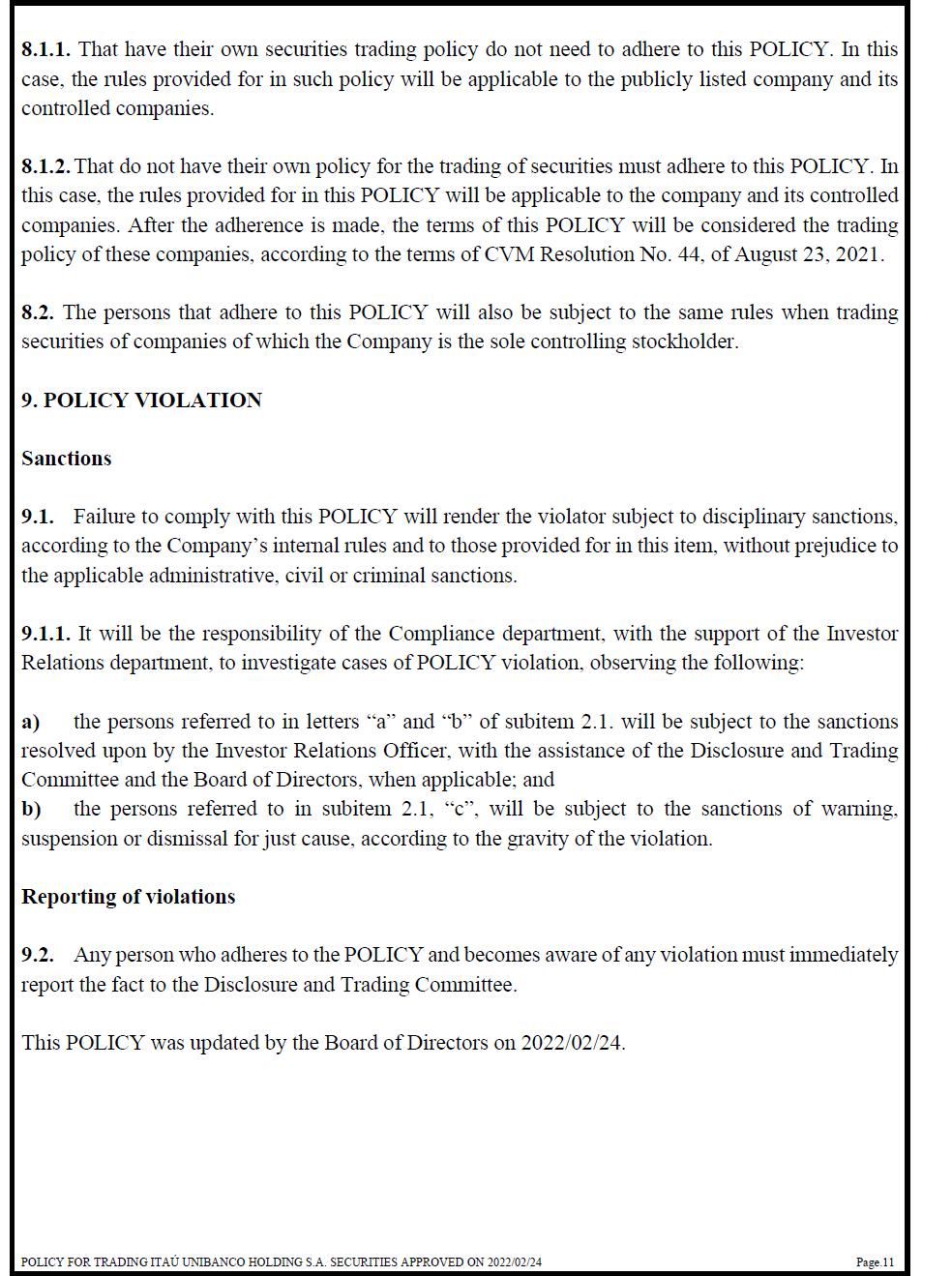 8.1.1. That have their own securities trading policy do not need to adhere to this POLICY. In this case, the rules provided for in such policy will be applicable to the publicly listed company and its controlled companies. 8.1.2. That do not have their own policy for the trading of securities must adhere to this POLICY. In this case, the rules provided for in this POLICY will be applicable to the company and its controlled companies. After the adherence is made, the terms of this POLICY will be considered the trading policy of these companies, according to the terms of CVM Resolution No. 44, of August 23, 2021. 8.2. The persons that adhere to this POLICY will also be subject to the same rules when trading securities of companies of which the Company is the sole controlling stockholder. 9. POLICY VIOLATION Sanctions 9.1. Failure to comply with this POLICY will render the violator subject to disciplinary sanctions, according to the Company’s internal rules and to those provided for in this item, without prejudice to the applicable administrative, civil or criminal sanctions. 9.1.1. It will be the responsibility of the Compliance department, with the support of the Investor Relations department, to investigate cases of POLICY violation, observing the following: a) the persons referred to in letters “a” and “b” of subitem 2.1. will be subject to the sanctions resolved upon by the Investor Relations Officer, with the assistance of the Disclosure and Trading Committee and the Board of Directors, when applicable; and b) the persons referred to in subitem 2.1, “c”, will be subject to the sanctions of warning, suspension or dismissal for just cause, according to the gravity of the violation. Reporting of violations 9.2. Any person who adheres to the POLICY and becomes aware of any violation must immediately report the fact to the Disclosure and Trading Committee. This POLICY was updated by the Board of Directors on 2022/02/24.