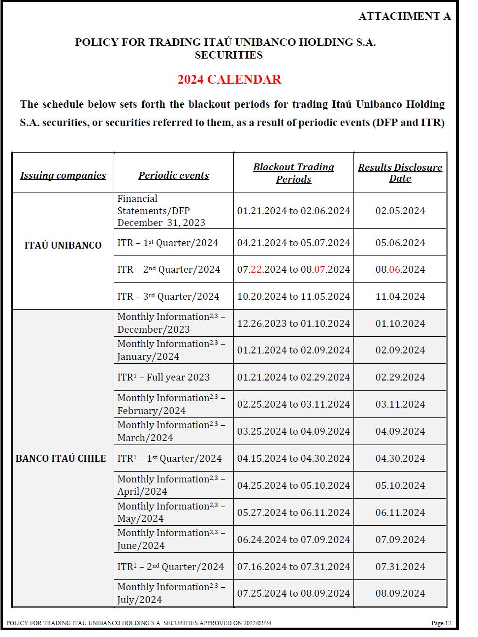 ATTACHMENT A POLICY FOR TRADING ITAÚ UNIBANCO HOLDING S.A. SECURITIES 2024 CALENDAR The schedule below sets forth the blackout periods for trading Itaú Unibanco Holding S.A. securities, or securities referred to them, as a result of periodic events (DFP and ITR) Issuing companies Periodic events Blackout Trading Periods Results Disclosure Date ITAÚ UNIBANCO Financial Statements/DFP December 31, 2023 01.21.2024 to 02.06.2024 02.05.2024 ITR – 1st Quarter/2024 04.21.2024 to 05.07.2024 05.06.2024 ITR – 2nd Quarter/2024 07.22.2024 to 08.07.2024 08.06.2024 ITR – 3rd Quarter/2024 10.20.2024 to 11.05.2024 11.04.2024 BANCO ITAÚ CHILE Monthly Information2,3 – December/2023 12.26.2023 to 01.10.2024 01.10.2024 Monthly Information2,3 – January/2024 01.21.2024 to 02.09.2024 02.09.2024 ITR1 – Full year 2023 01.21.2024 to 02.29.2024 02.29.2024 Monthly Information2,3 – February/2024 02.25.2024 to 03.11.2024 03.11.2024 Monthly Information2,3 – March/2024 03.25.2024 to 04.09.2024 04.09.2024 ITR1 – 1st Quarter/2024 04.15.2024 to 04.30.2024 04.30.2024 Monthly Information2,3 – April/2024 04.25.2024 to 05.10.2024 05.10.2024 Monthly Information2,3 – May/2024 05.27.2024 to 06.11.2024 06.11.2024 Monthly Information2,3 – June/2024 06.24.2024 to 07.09.2024 07.09.2024 ITR1 – 2nd Quarter/2024 07.16.2024 to 07.31.2024 07.31.2024 Monthly Information2,3 – July/2024 07.25.2024 to 08.09.2024 08.09.2024