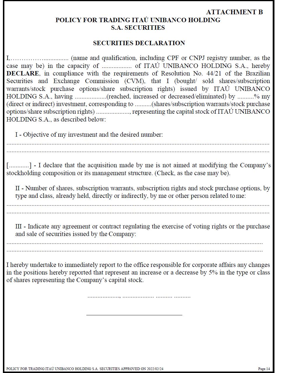 ATTACHMENT B POLICY FOR TRADING ITAÚ UNIBANCO HOLDING S.A. SECURITIES SECURITIES DECLARATION I,……………............... (name and qualification, including CPF or CNPJ registry number, as the case may be) in the capacity of .................. of ITAÚ UNIBANCO HOLDING S.A., hereby DECLARE, in compliance with the requirements of Resolution No. 44/21 of the Brazilian Securities and Exchange Commission (CVM), that I (bought/ sold shares/subscription warrants/stock purchase options/share subscription rights) issued by ITAÚ UNIBANCO HOLDING S.A., having ...................(reached, increased or decreased/eliminated) by ..........% my (direct or indirect) investment, corresponding to ..........(shares/subscription warrants/stock purchase options/share subscription rights) ...................., representing the capital stock of ITAÚ UNIBANCO HOLDING S.A., as described below: I - Objective of my investment and the desired number: ............................................................................................................................................................................................................................................................................................................................ [ ............ ] - I declare that the acquisition made by me is not aimed at modifying the Company’s stockholding composition or its management structure. (Check, as the case may be). II - Number of shares, subscription warrants, subscription rights and stock purchase options, by type and class, already held, directly or indirectly, by me or other person related to me: ............................................................................................................................................................................................................................................................................................................................ III - Indicate any agreement or contract regulating the exercise of voting rights or the purchase and sale of securities issued by the Company: .......................................................................................................................................................... .......................................................................................................................................................... I hereby undertake to immediately report to the office responsible for corporate affairs any changes in the positions hereby reported that represent an increase or a decrease by 5% in the type or class of shares representing the Company’s capital stock. ..................., ................... .......... .......... _____________________________