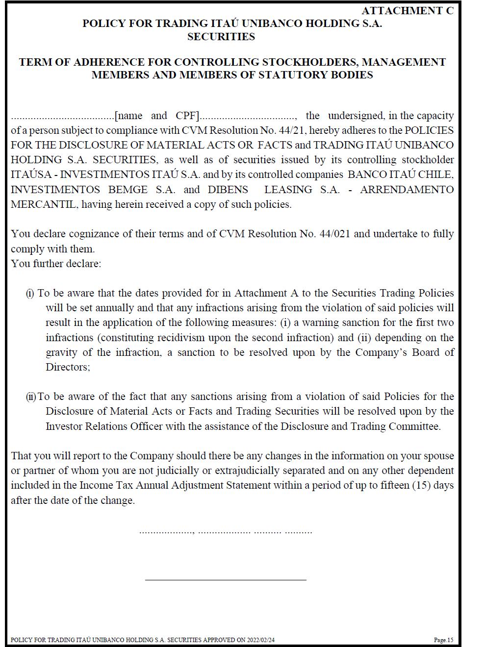 ATTACHMENT C POLICY FOR TRADING ITAÚ UNIBANCO HOLDING S.A. SECURITIES TERM OF ADHERENCE FOR CONTROLLING STOCKHOLDERS, MANAGEMENT MEMBERS AND MEMBERS OF STATUTORY BODIES .....................................[name and CPF].................................., the undersigned, in the capacity of a person subject to compliance with CVM Resolution No. 44/21, hereby adheres to the POLICIES FOR THE DISCLOSURE OF MATERIAL ACTS OR FACTS and TRADING ITAÚ UNIBANCO HOLDING S.A. SECURITIES, as well as of securities issued by its controlling stockholder ITAÚSA - INVESTIMENTOS ITAÚ S.A. and by its controlled companies BANCO ITAÚ CHILE, INVESTIMENTOS BEMGE S.A. and DIBENS LEASING S.A. - ARRENDAMENTO MERCANTIL, having herein received a copy of such policies. You declare cognizance of their terms and of CVM Resolution No. 44/021 and undertake to fully comply with them. You further declare: (i) To be aware that the dates provided for in Attachment A to the Securities Trading Policies will be set annually and that any infractions arising from the violation of said policies will result in the application of the following measures: (i) a warning sanction for the first two infractions (constituting recidivism upon the second infraction) and (ii) depending on the gravity of the infraction, a sanction to be resolved upon by the Company’s Board of Directors; (ii) To be aware of the fact that any sanctions arising from a violation of said Policies for the Disclosure of Material Acts or Facts and Trading Securities will be resolved upon by the Investor Relations Officer with the assistance of the Disclosure and Trading Committee. That you will report to the Company should there be any changes in the information on your spouse or partner of whom you are not judicially or extrajudicially separated and on any other dependent included in the Income Tax Annual Adjustment Statement within a period of up to fifteen (15) days after the date of the change. ..................., ................... .......... .......... _____________________________
