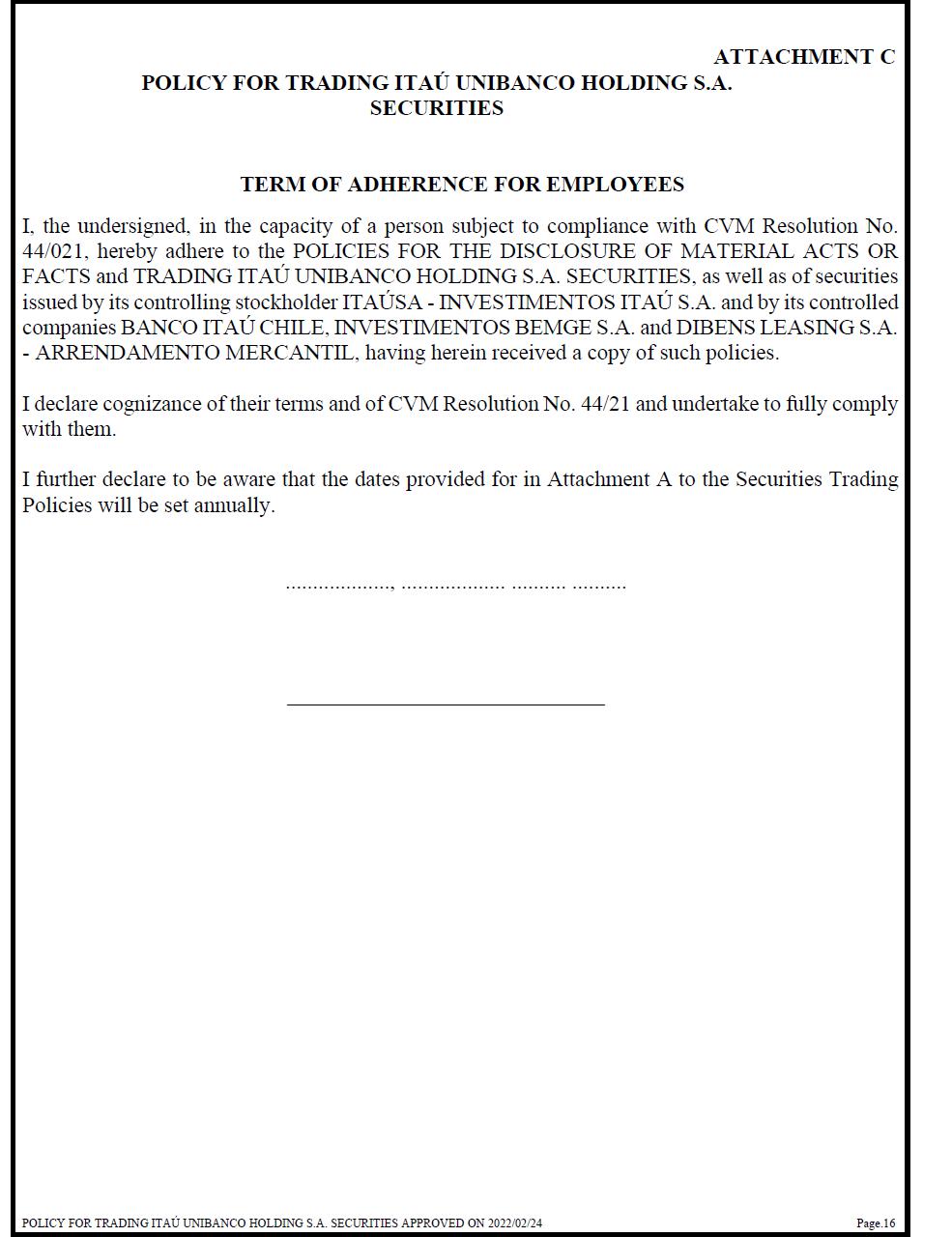 ATTACHMENT C POLICY FOR TRADING ITAÚ UNIBANCO HOLDING S.A. SECURITIES TERM OF ADHERENCE FOR EMPLOYEES I, the undersigned, in the capacity of a person subject to compliance with CVM Resolution No. 44/021, hereby adhere to the POLICIES FOR THE DISCLOSURE OF MATERIAL ACTS OR FACTS and TRADING ITAÚ UNIBANCO HOLDING S.A. SECURITIES, as well as of securities issued by its controlling stockholder ITAÚSA - INVESTIMENTOS ITAÚ S.A. and by its controlled companies BANCO ITAÚ CHILE, INVESTIMENTOS BEMGE S.A. and DIBENS LEASING S.A. - ARRENDAMENTO MERCANTIL, having herein received a copy of such policies. I declare cognizance of their terms and of CVM Resolution No. 44/21 and undertake to fully comply with them. I further declare to be aware that the dates provided for in Attachment A to the Securities Trading Policies will be set annually.