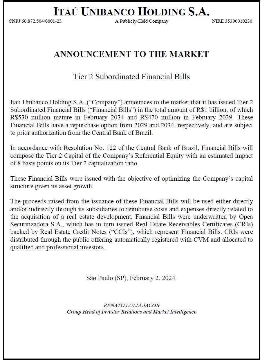 ITAÚ UNIBANCO HOLDING S.A. CNPJ 60.872.504/0001-23 A Publicly-Held Company NIRE 35300010230 ANNOUNCEMENT TO THE MARKET Tier 2 Subordinated Financial Bills Itaú Unibanco Holding S.A. (“Company”) announces to the market that it has issued Tier 2 Subordinated Financial Bills (“Financial Bills”) in the total amount of R$1 billion, of which R$530 million mature in February 2034 and R$470 million in February 2039. These Financial Bills have a repurchase option from 2029 and 2034, respectively, and are subject to prior authorization from the Central Bank of Brazil. In accordance with Resolution No. 122 of the Central Bank of Brazil, Financial Bills will compose the Tier 2 Capital of the Company’s Referential Equity with an estimated impact of 8 basis points on its Tier 2 capitalization ratio. These Financial Bills were issued with the objective of optimizing the Company´s capital structure given its asset growth. The proceeds raised from the issuance of these Financial Bills will be used either directly and/or indirectly through its subsidiaries to reimburse costs and expenses directly related to the acquisition of a real estate development. Financial Bills were underwritten by Opea Securitizadora S.A., which has in turn issued Real Estate Receivables Certificates (CRIs) backed by Real Estate Credit Notes (“CCIs”), which represent Financial Bills. CRIs were distributed through the public offering automatically registered with CVM and allocated to qualified and professional investors. São Paulo (SP), February 2, 2024. RENATO LULIA JACOB Group Head of Investor Relations and Market Intelligence