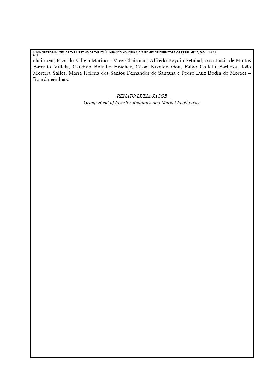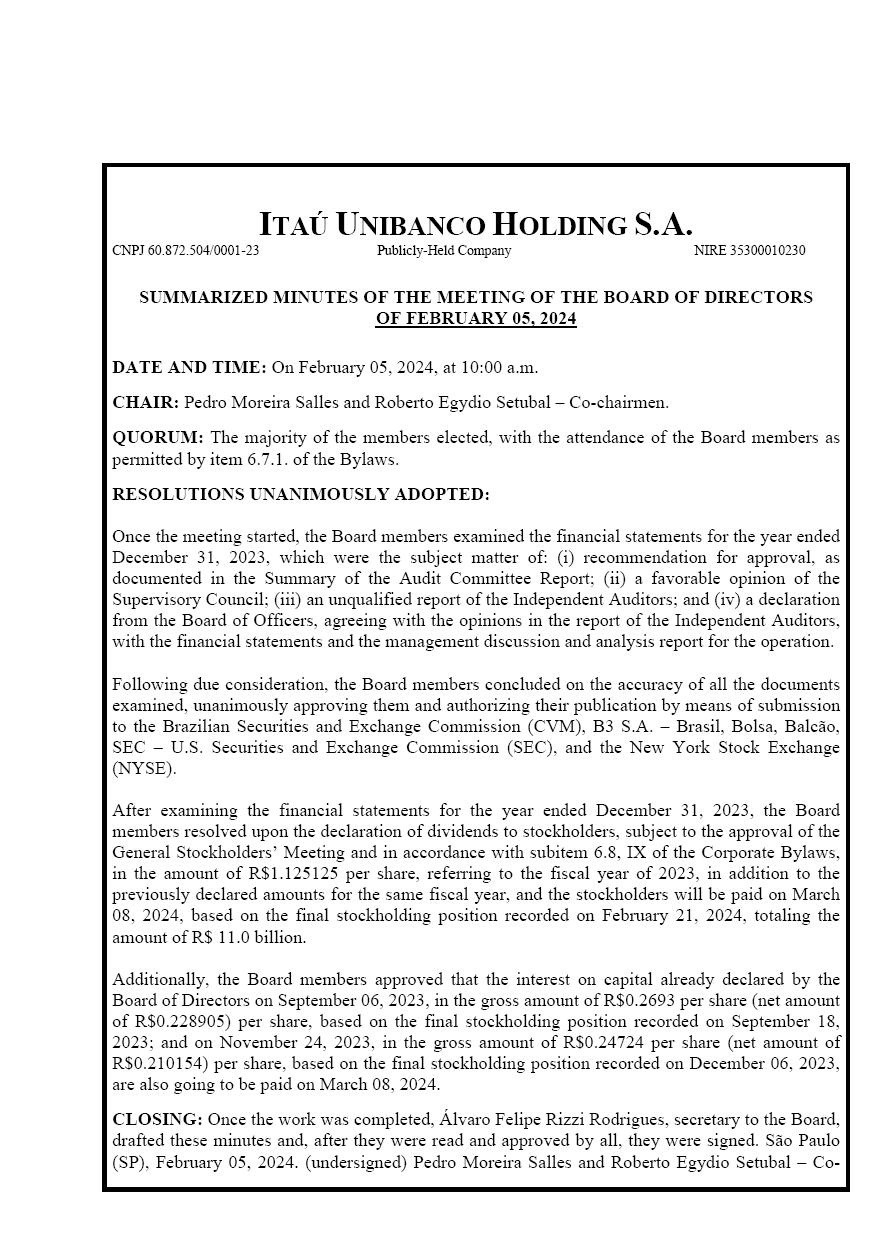 ITAÚ UNIBANCO HOLDING S.A. CNPJ 60.872.504/0001-23 Publicly-Held Company NIRE 35300010230 SUMMARIZED MINUTES OF THE MEETING OF THE BOARD OF DIRECTORS OF FEBRUARY 05, 2024 DATE AND TIME: On February 05, 2024, at 10:00 a.m. CHAIR: Pedro Moreira Salles and Roberto Egydio Setubal – Co-chairmen. QUORUM: The majority of the members elected, with the attendance of the Board members as permitted by item 6.7.1. of the Bylaws. RESOLUTIONS UNANIMOUSLY ADOPTED: Once the meeting started, the Board members examined the financial statements for the year ended December 31, 2023, which were the subject matter of: (i) recommendation for approval, as documented in the Summary of the Audit Committee Report; (ii) a favorable opinion of the Supervisory Council; (iii) an unqualified report of the Independent Auditors; and (iv) a declaration from the Board of Officers, agreeing with the opinions in the report of the Independent Auditors, with the financial statements and the management discussion and analysis report for the operation. Following due consideration, the Board members concluded on the accuracy of all the documents examined, unanimously approving them and authorizing their publication by means of submission to the Brazilian Securities and Exchange Commission (CVM), B3 S.A. – Brasil, Bolsa, Balcão, SEC – U.S. Securities and Exchange Commission (SEC), and the New York Stock Exchange (NYSE). After examining the financial statements for the year ended December 31, 2023, the Board members resolved upon the declaration of dividends to stockholders, subject to the approval of the General Stockholders’ Meeting and in accordance with subitem 6.8, IX of the Corporate Bylaws, in the amount of R$1.125125 per share, referring to the fiscal year of 2023, in addition to the previously declared amounts for the same fiscal year, and the stockholders will be paid on March 08, 2024, based on the final stockholding position recorded on February 21, 2024, totaling the amount of R$ 11.0 billion. Additionally, the Board members approved that the interest on capital already declared by the Board of Directors on September 06, 2023, in the gross amount of R$0.2693 per share (net amount of R$0.228905) per share, based on the final stockholding position recorded on September 18, 2023; and on November 24, 2023, in the gross amount of R$0.24724 per share (net amount of R$0.210154) per share, based on the final stockholding position recorded on December 06, 2023, are also going to be paid on March 08, 2024. CLOSING: Once the work was completed, Álvaro Felipe Rizzi Rodrigues, secretary to the Board, drafted these minutes and, after they were read and approved by all, they were signed. São Paulo (SP), February 05, 2024. (undersigned) Pedro Moreira Salles and Roberto Egydio Setubal – Co- SUMMARIZED MINUTES OF THE MEETING OF THE ITAÚ UNIBANCO HOLDING S.A.’S BOARD OF DIRECTORS OF FEBRUARY 5, 2024 – 10 A.M. fls.2 chairmen; Ricardo Villela Marino – Vice Chairman; Alfredo Egydio Setubal, Ana Lúcia de Mattos Barretto Villela, Candido Botelho Bracher, César Nivaldo Gon, Fábio Colletti Barbosa, João Moreira Salles, Maria Helena dos Santos Fernandes de Santana e Pedro Luiz Bodin de Moraes – Board members. RENATO LULIA JACOB Group Head of Investor Relations and Market Intelligence