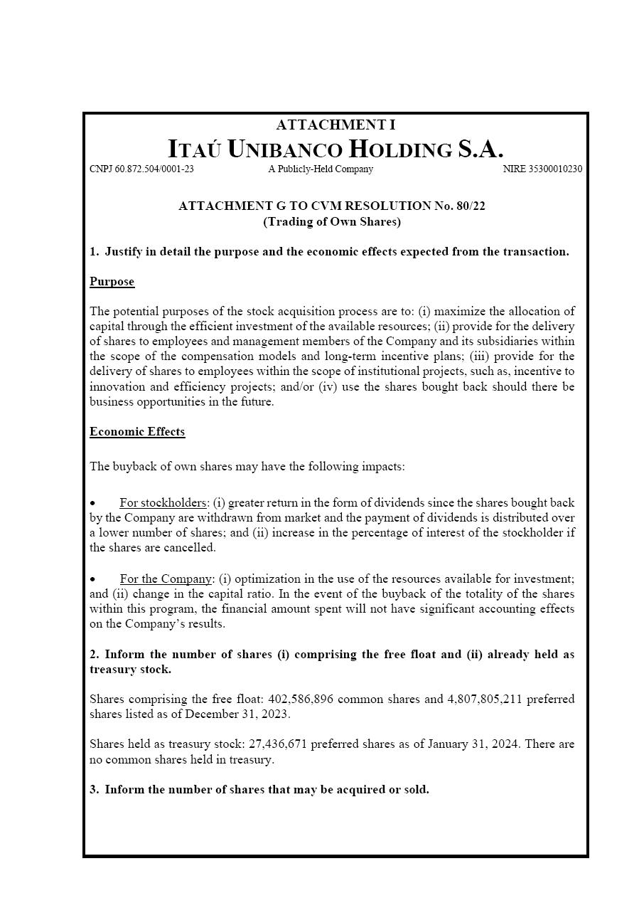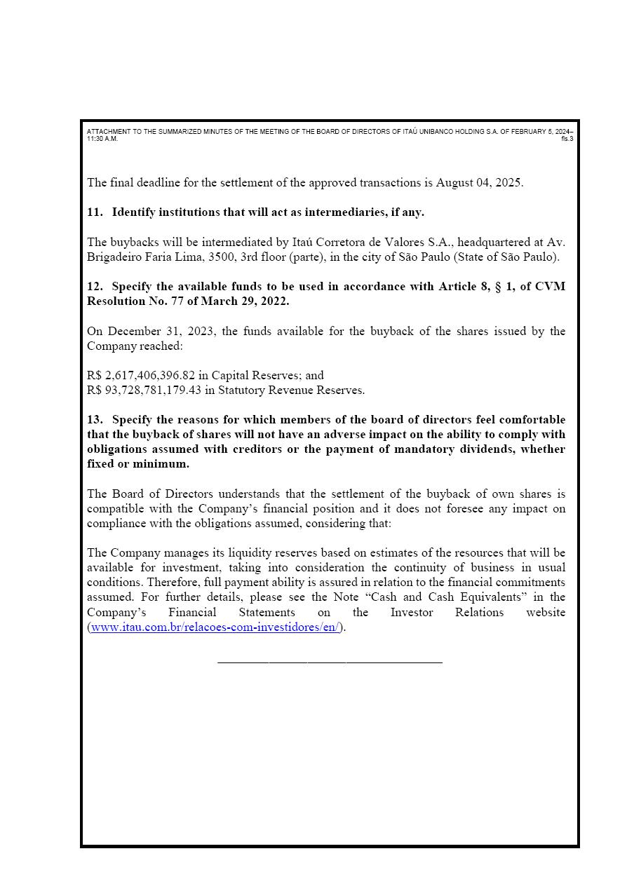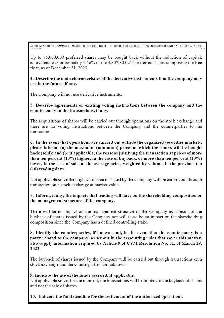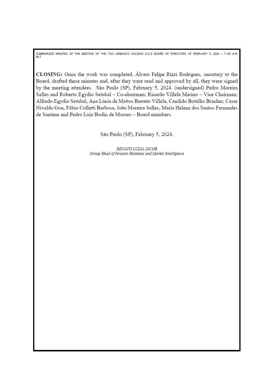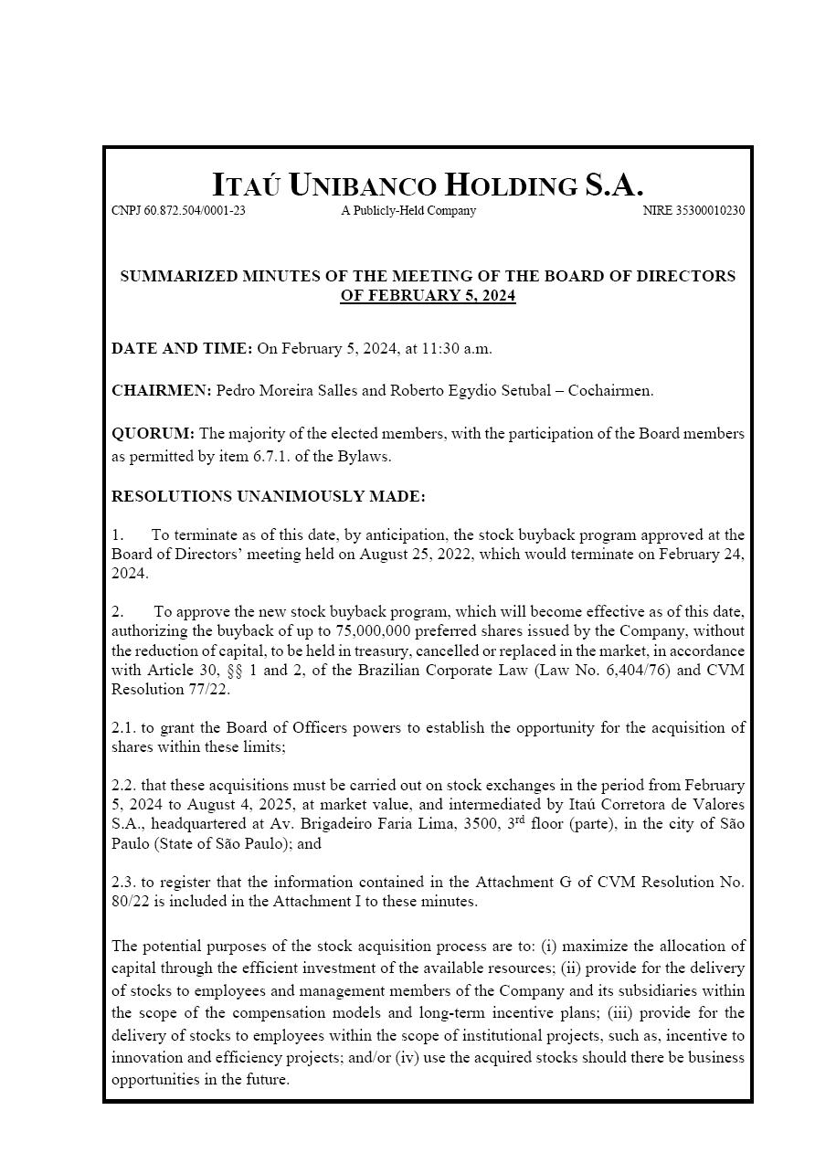 ITAÚ UNIBANCO HOLDING S.A. CNPJ 60.872.504/0001-23 A Publicly-Held Company NIRE 35300010230 SUMMARIZED MINUTES OF THE MEETING OF THE BOARD OF DIRECTORS OF FEBRUARY 5, 2024 DATE AND TIME: On February 5, 2024, at 11:30 a.m. CHAIRMEN: Pedro Moreira Salles and Roberto Egydio Setubal – Cochairmen. QUORUM: The majority of the elected members, with the participation of the Board members as permitted by item 6.7.1. of the Bylaws. RESOLUTIONS UNANIMOUSLY MADE: 1. To terminate as of this date, by anticipation, the stock buyback program approved at the Board of Directors’ meeting held on August 25, 2022, which would terminate on February 24, 2024. 2. To approve the new stock buyback program, which will become effective as of this date, authorizing the buyback of up to 75,000,000 preferred shares issued by the Company, without the reduction of capital, to be held in treasury, cancelled or replaced in the market, in accordance with Article 30, §§ 1 and 2, of the Brazilian Corporate Law (Law No. 6,404/76) and CVM Resolution 77/22. 2.1. to grant the Board of Officers powers to establish the opportunity for the acquisition of shares within these limits; 2.2. that these acquisitions must be carried out on stock exchanges in the period from February 5, 2024 to August 4, 2025, at market value, and intermediated by Itaú Corretora de Valores S.A., headquartered at Av. Brigadeiro Faria Lima, 3500, 3rd floor (parte), in the city of São Paulo (State of São Paulo); and 2.3. to register that the information contained in the Attachment G of CVM Resolution No. 80/22 is included in the Attachment I to these minutes. The potential purposes of the stock acquisition process are to: (i) maximize the allocation of capital through the efficient investment of the available resources; (ii) provide for the delivery of stocks to employees and management members of the Company and its subsidiaries within the scope of the compensation models and long-term incentive plans; (iii) provide for the delivery of stocks to employees within the scope of institutional projects, such as, incentive to innovation and efficiency projects; and/or (iv) use the acquired stocks should there be business opportunities in the future. SUMMARIZED MINUTES OF THE MEETING OF THE ITAÚ UNIBANCO HOLDING S.A.’S BOARD OF DIRECTORS OF FEBRUARY 5, 2024 – 11:30 A.M. fls.2 CLOSING: Once the work was completed, Álvaro Felipe Rizzi Rodrigues, secretary to the Board, drafted these minutes and, after they were read and approved by all, they were signed by the meeting attendees. São Paulo (SP), February 5, 2024. (undersigned) Pedro Moreira Salles and Roberto Egydio Setubal – Co-chairmen; Ricardo Villela Marino – Vice Chairman; Alfredo Egydio Setubal, Ana Lúcia de Mattos Barreto Villela, Candido Botelho Bracher, Cesar Nivaldo Gon, Fábio Colletti Barbosa, João Moreira Salles, Maria Helena dos Santos Fernandes de Santana and Pedro Luiz Bodin de Moraes – Board members. São Paulo (SP), February 5, 2024. RENATO LULIA JACOB Group Head of Investor Relations and Market Intelligence ATTACHMENT I ITAÚ UNIBANCO HOLDING S.A. CNPJ 60.872.504/0001-23 A Publicly-Held Company NIRE 35300010230 ATTACHMENT G TO CVM RESOLUTION No. 80/22 (Trading of Own Shares) 1. Justify in detail the purpose and the economic effects expected from the transaction. Purpose The potential purposes of the stock acquisition process are to: (i) maximize the allocation of capital through the efficient investment of the available resources; (ii) provide for the delivery of shares to employees and management members of the Company and its subsidiaries within the scope of the compensation models and long-term incentive plans; (iii) provide for the delivery of shares to employees within the scope of institutional projects, such as, incentive to innovation and efficiency projects; and/or (iv) use the shares bought back should there be business opportunities in the future. Economic Effects The buyback of own shares may have the following impacts: • For stockholders: (i) greater return in the form of dividends since the shares bought back by the Company are withdrawn from market and the payment of dividends is distributed over a lower number of shares; and (ii) increase in the percentage of interest of the stockholder if the shares are cancelled. • For the Company: (i) optimization in the use of the resources available for investment; and (ii) change in the capital ratio. In the event of the buyback of the totality of the shares within this program, the financial amount spent will not have significant accounting effects on the Company’s results. 2. Inform the number of shares (i) comprising the free float and (ii) already held as treasury stock. Shares comprising the free float: 402,586,896 common shares and 4,807,805,211 preferred shares listed as of December 31, 2023. Shares held as treasury stock: 27,436,671 preferred shares as of January 31, 2024. There are no common shares held in treasury. 3. Inform the number of shares that may be acquired or sold. ATTACHMENT TO THE SUMMARIZED MINUTES OF THE MEETING OF THE BOARD OF DIRECTORS OF ITAÚ UNIBANCO HOLDING S.A. OF FEBRUARY 5, 2024– 11:30 A.M. fls.2 Up to 75,000,000 preferred shares may be bought back without the reduction of capital, equivalent to approximately 1.56% of the 4,807,805,211 preferred shares comprising the free float, as of December 31, 2023. 4. Describe the main characteristics of the derivative instruments that the company may use in the future, if any. The Company will not use derivative instruments. 5. Describe agreements or existing voting instructions between the company and the counterparty to the transactions, if any. The acquisitions of shares will be carried out through operations on the stock exchange and there are no voting instructions between the Company and the counterparties to the transaction. 6. In the event that operations are carried out outside the organized securities markets, please inform: (a) t